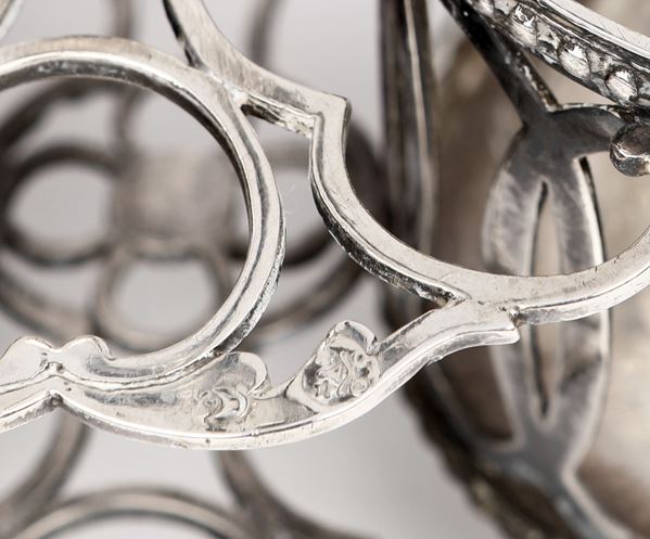 due ampolle in vetro con tappo racchiuse in alloggi traforati a motivi ovali intersecantesi fra loro, orli perlinati
