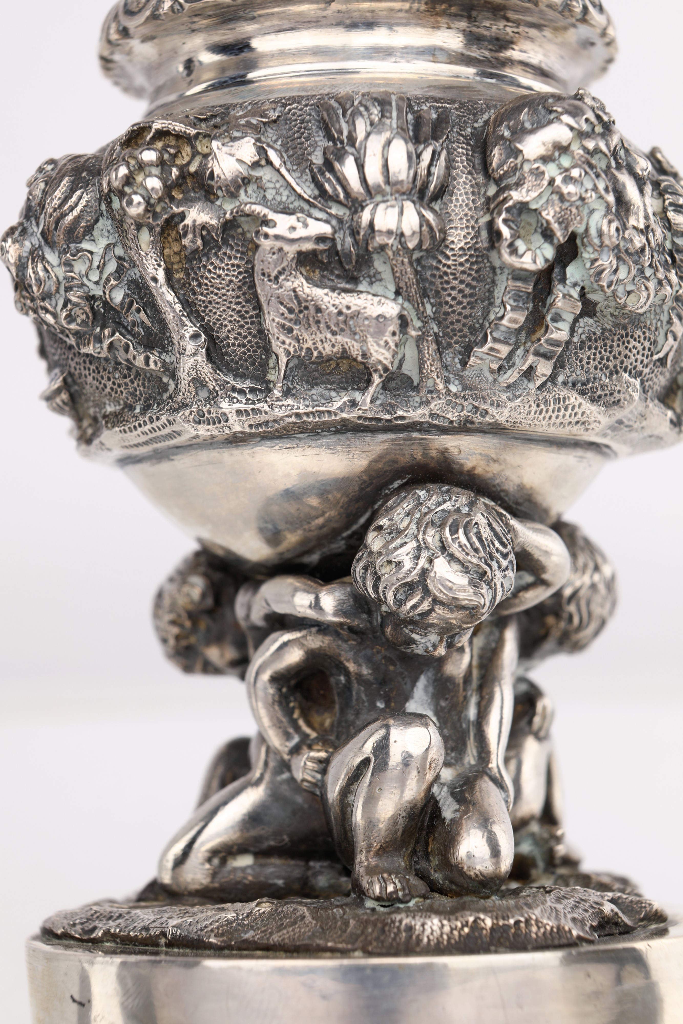 a forma di coppa sorretta da tre figure di amorino inginocchiato su base circolare liscia; fascia decorata in bassorilievo da teste desunte dal repertorio classico, animali e trofei emergenti dal fondo inciso al bulino; coperchio con ciglio percorso da unghiature, dominato da piccolo gruppo scultoreo con putto abbracciato ad un cigno