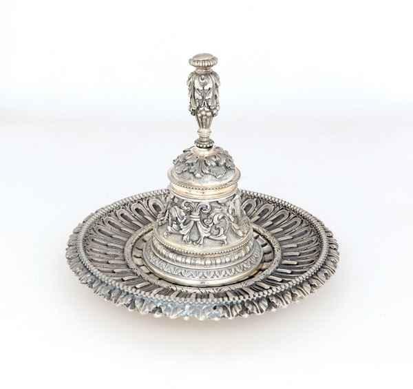 Campanella con piattino in argento 800/000, argentiere Luigi Genazzi, Milano 1950 ca.