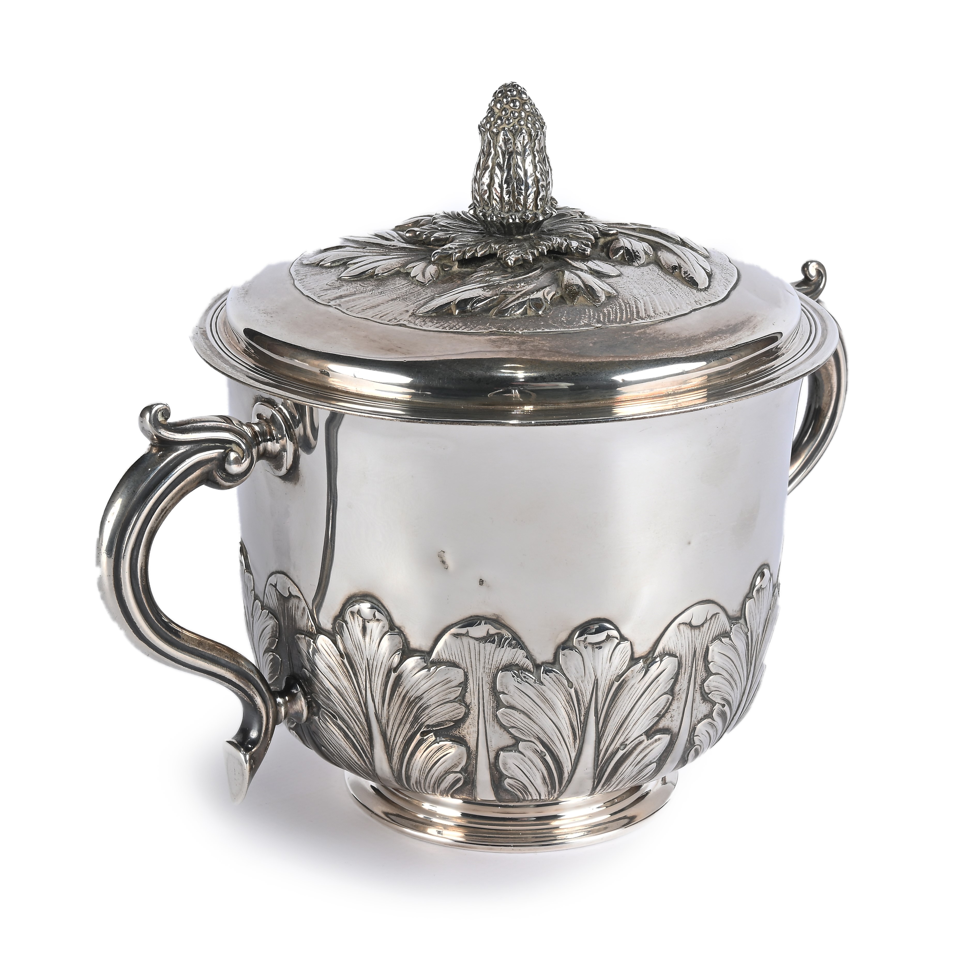 Coppa biansata in argento con coperchio, Londra 1886, argentiere J.N.M.