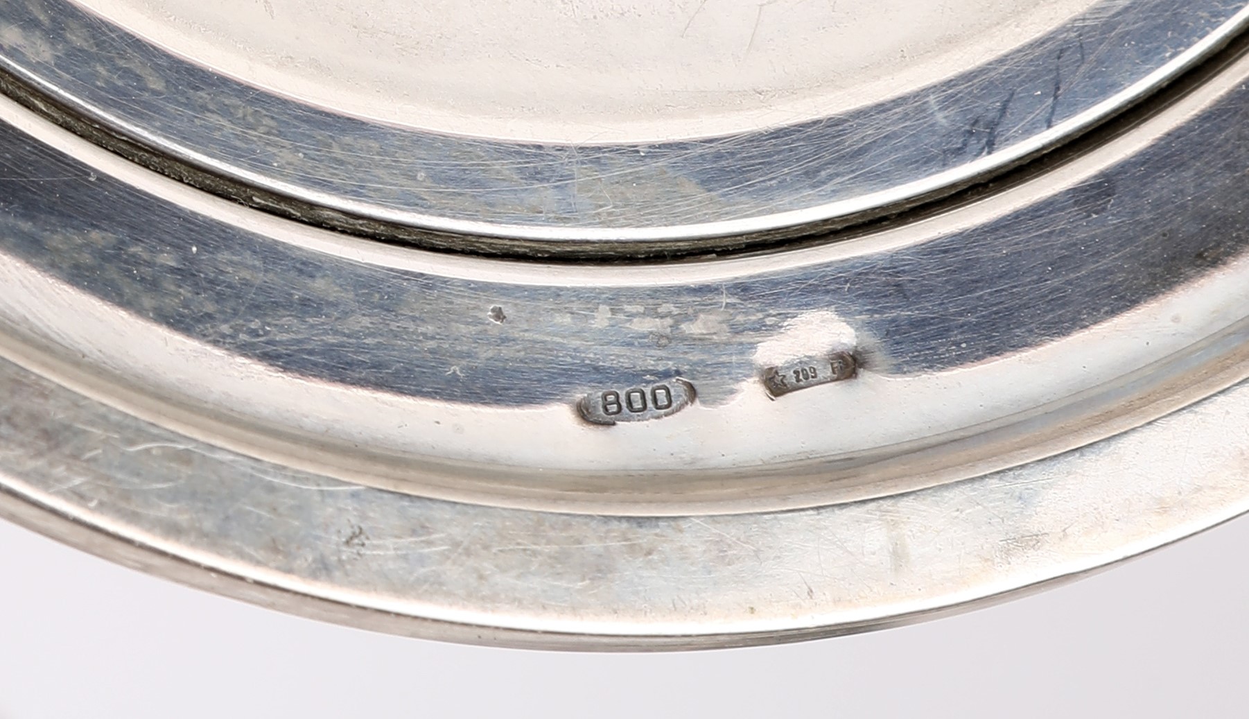 stelo in forma di colonna percorsa da nervature su piede circolare impreziosito da baccelli; sulla sommità portacandela in forma di vaso sotto al quale si dipartono quattro bracci arcuati sottolineati da rilievi vegetali. Difetti (ammaccature)
