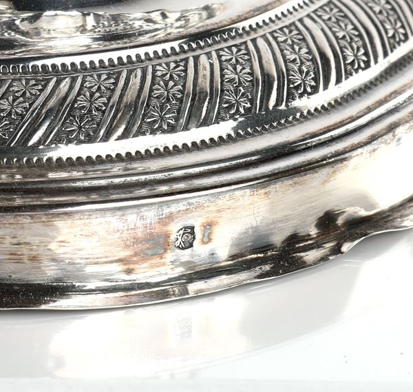 portacandela a forma di vaso a cratere con corpo baccellato, orlo e piede percorsi da guilloche minuziosamente cesellate, elemento decorativo ripreso alla base del montante in forma di colonna scanalata, emergente da un cespo fogliaceo sbalzato; piede circolare gradinato. Bollo pontificio post 1815
