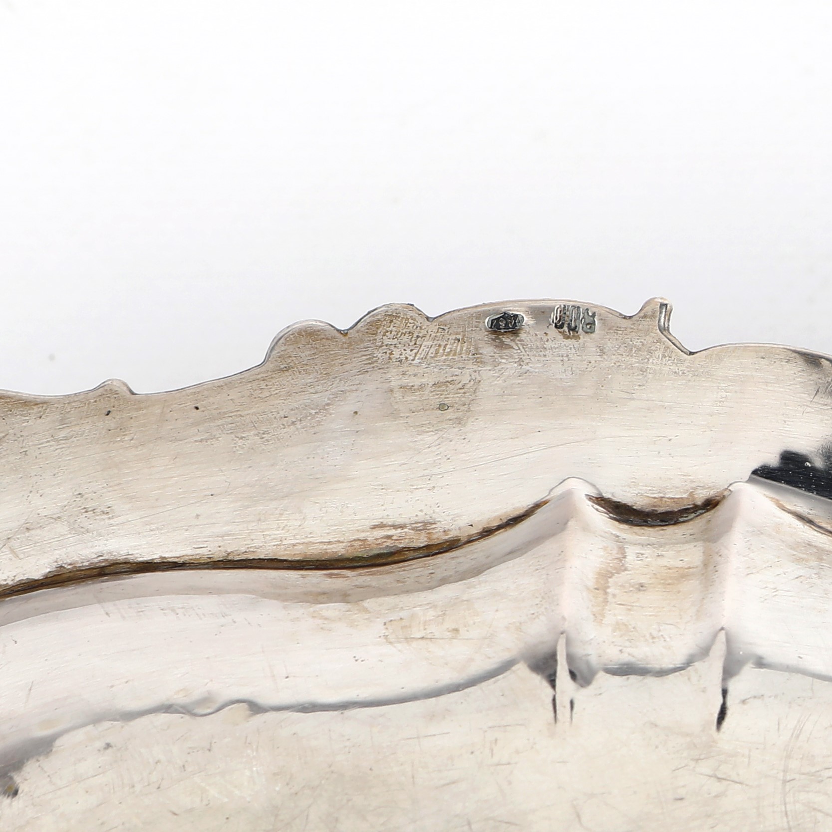 breve tesa satinata racchiusa da sottili volute contrapposte idealmente intrecciate intorno ad un esile stelo con festone di perline e ghirlanda di rose