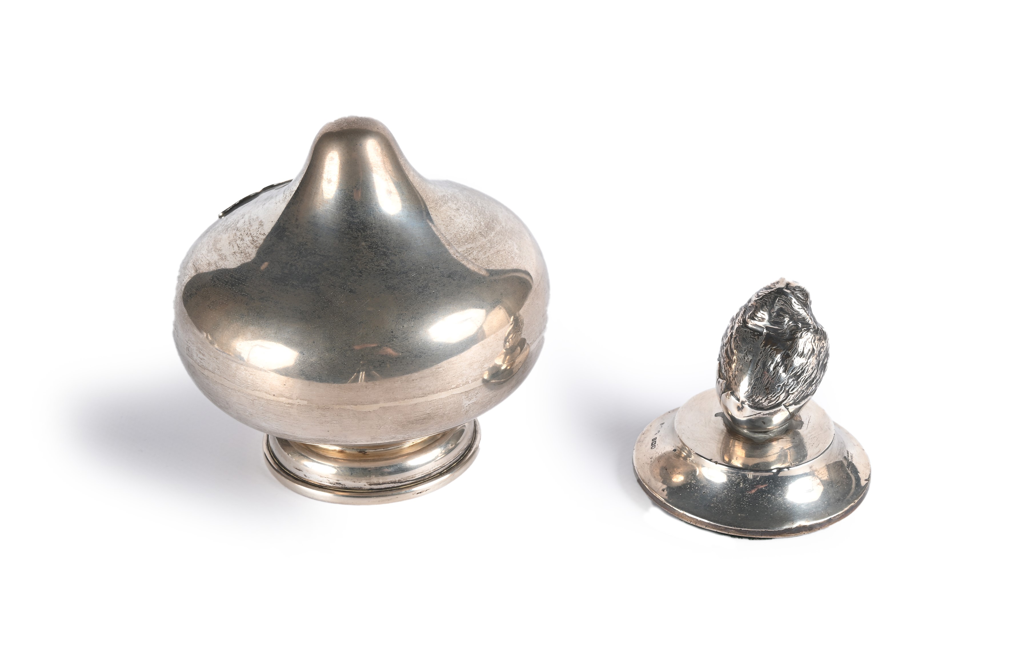 Salvadanaio in argento e fermacarte con pulcino, A. Barrett & Sons Piccadilly, Londra 1908