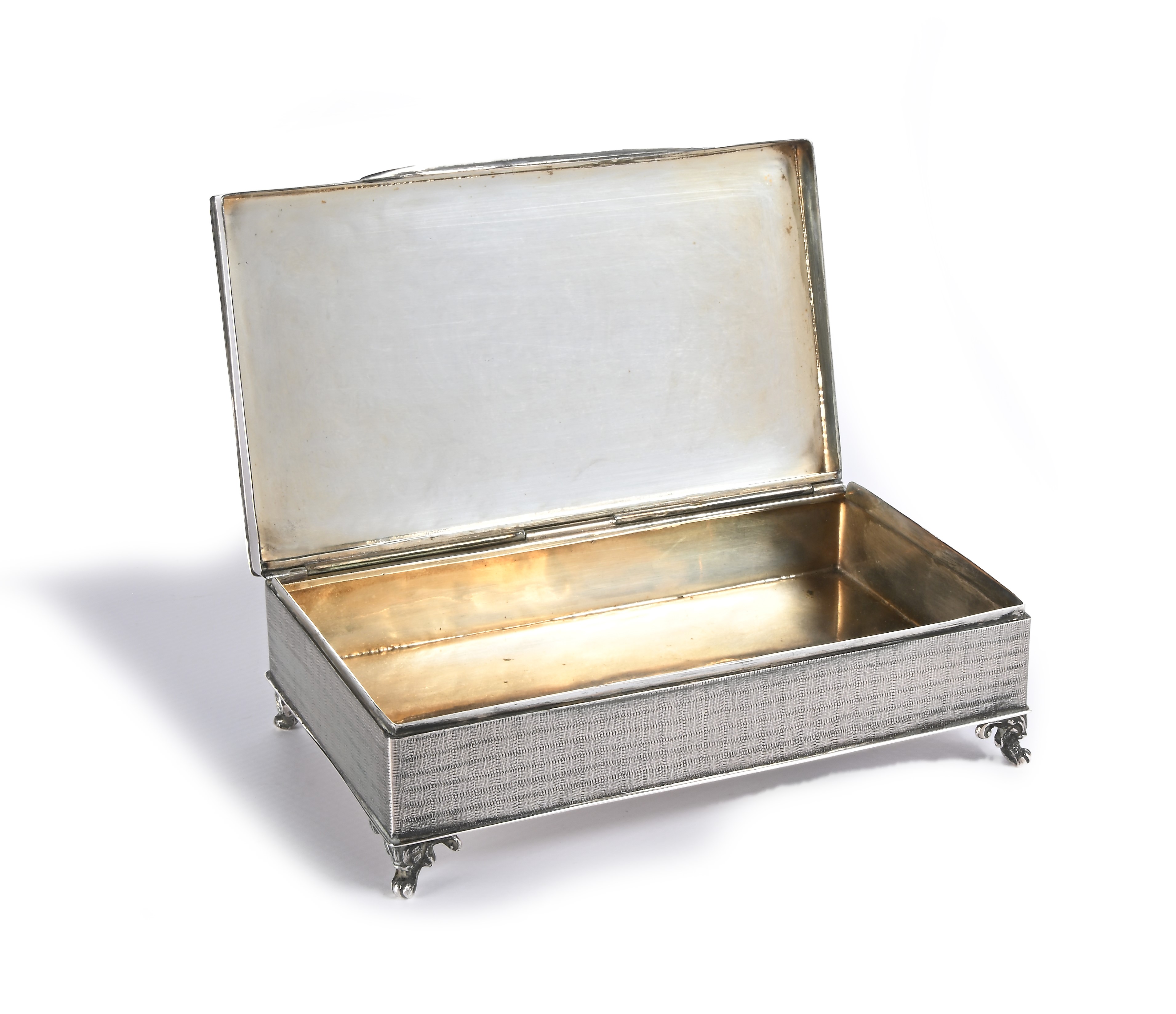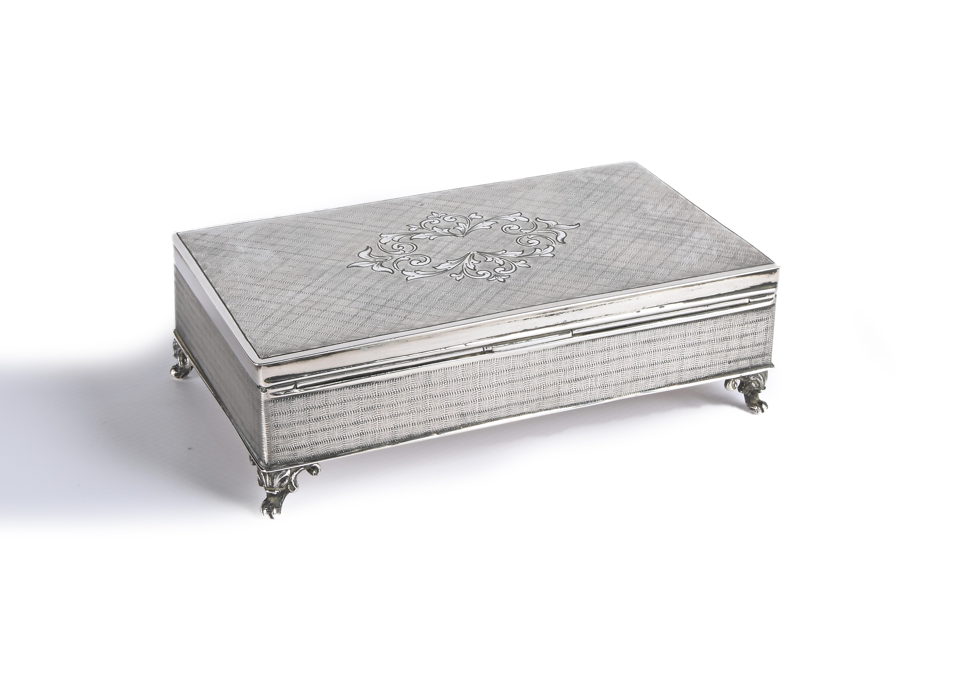 Scatola rettangolare in argento satinato con motivi vegetali incisi