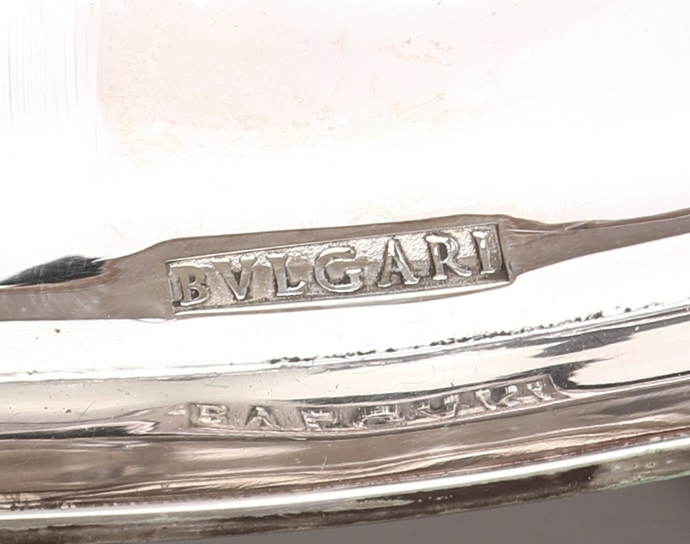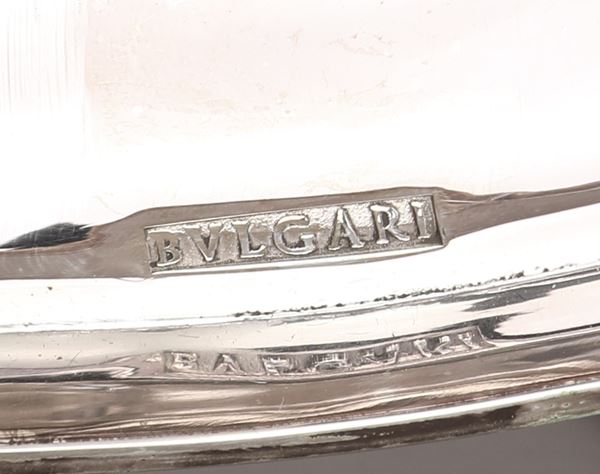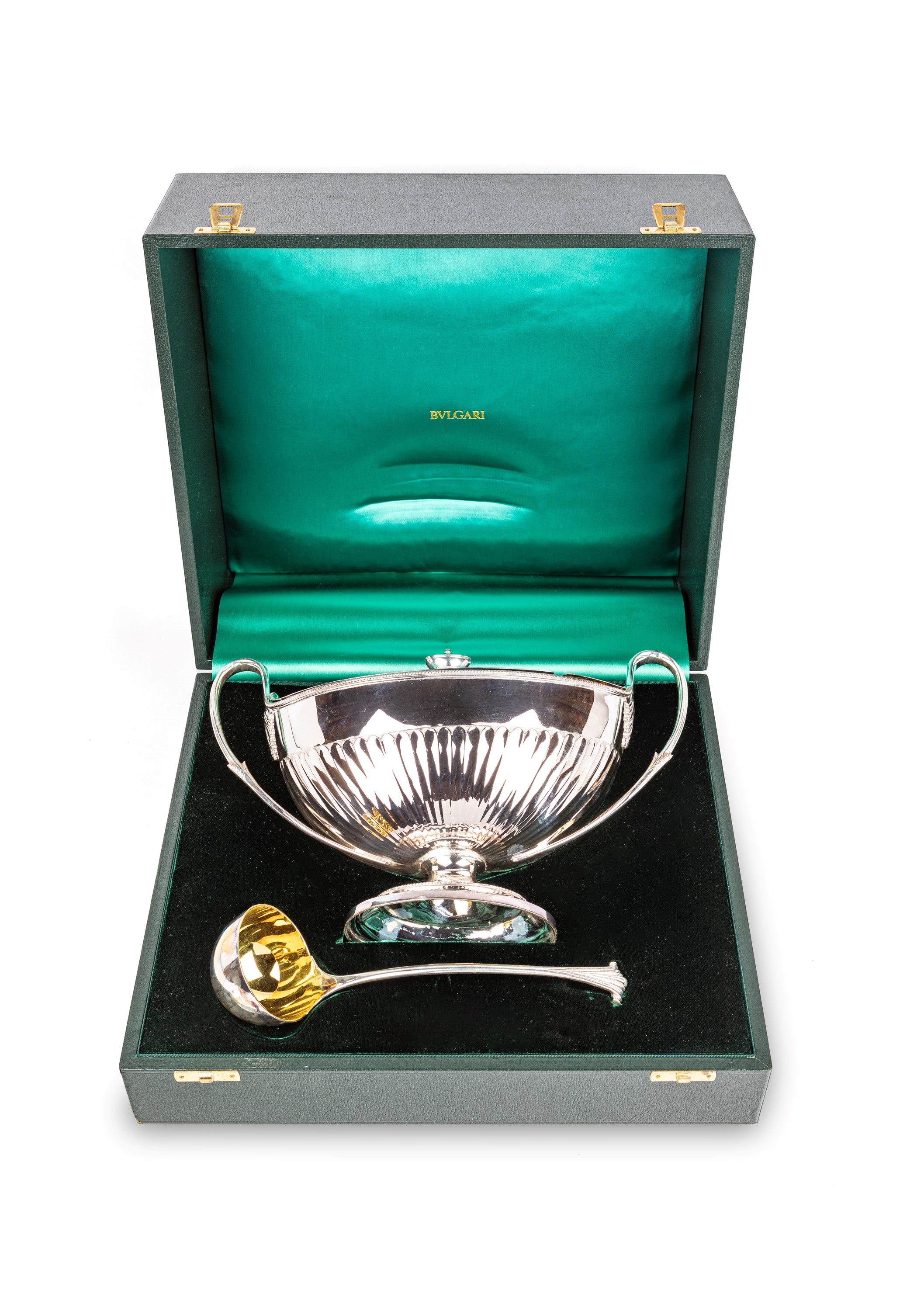 coppa ovale con parte inferiore scannellata, motivo distintivo ripreso sul coperchio rifinito sulla sommità da un pinnacolo; manici a nastro, piede circolare con profilo perlinato. Reca bolli inglesi e della Maison Bulgari. Entro scatola originale della Maison Bulgari, rivestita in pelle verde con impressioni dorate lungo i profili