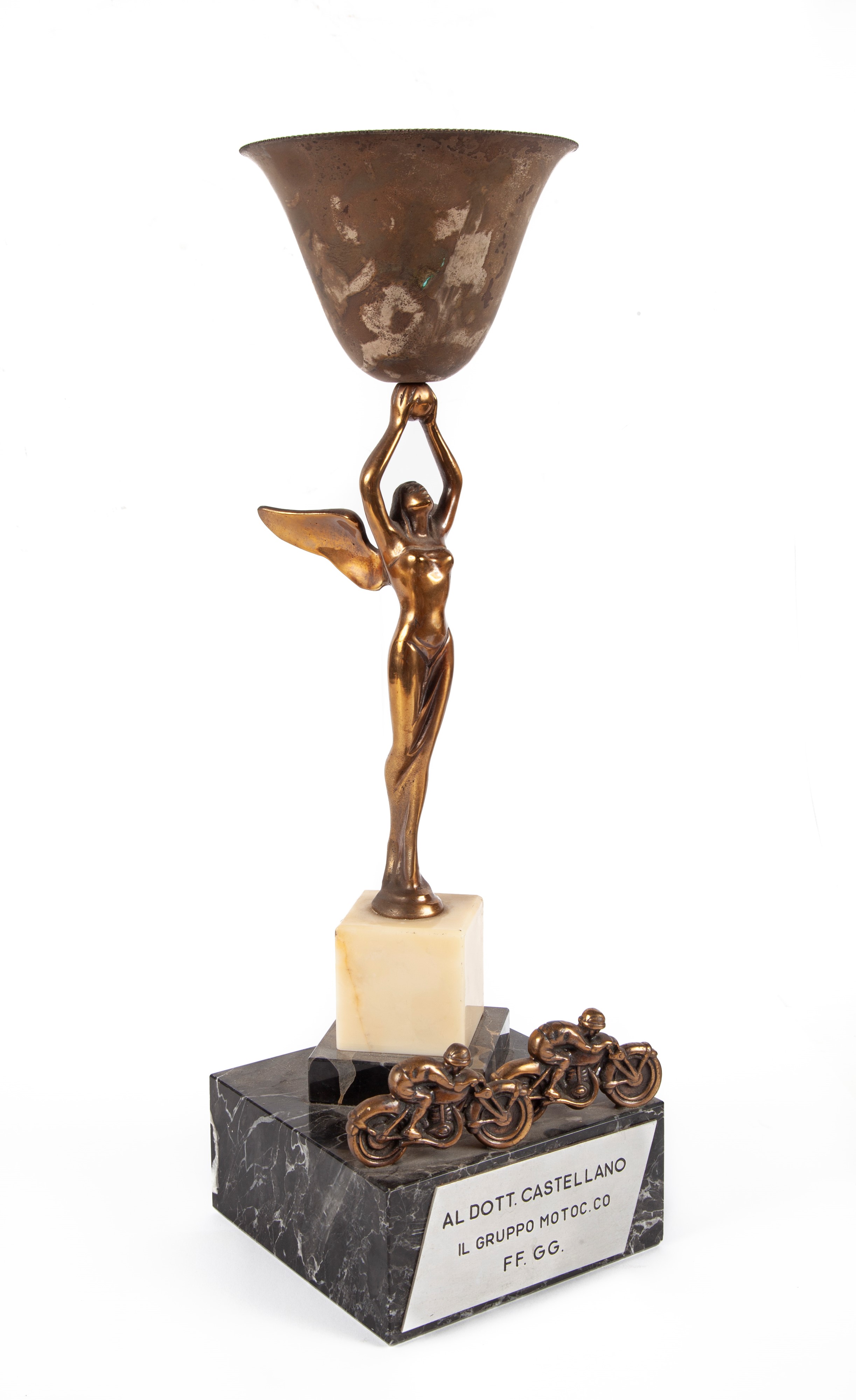 Trofeo Motociclistico delle Fiamme Gialle. Coppa in metallo sorretta dalla Vittoria Alata in ottone su base di marmo, con 2 motociclisti in ottone