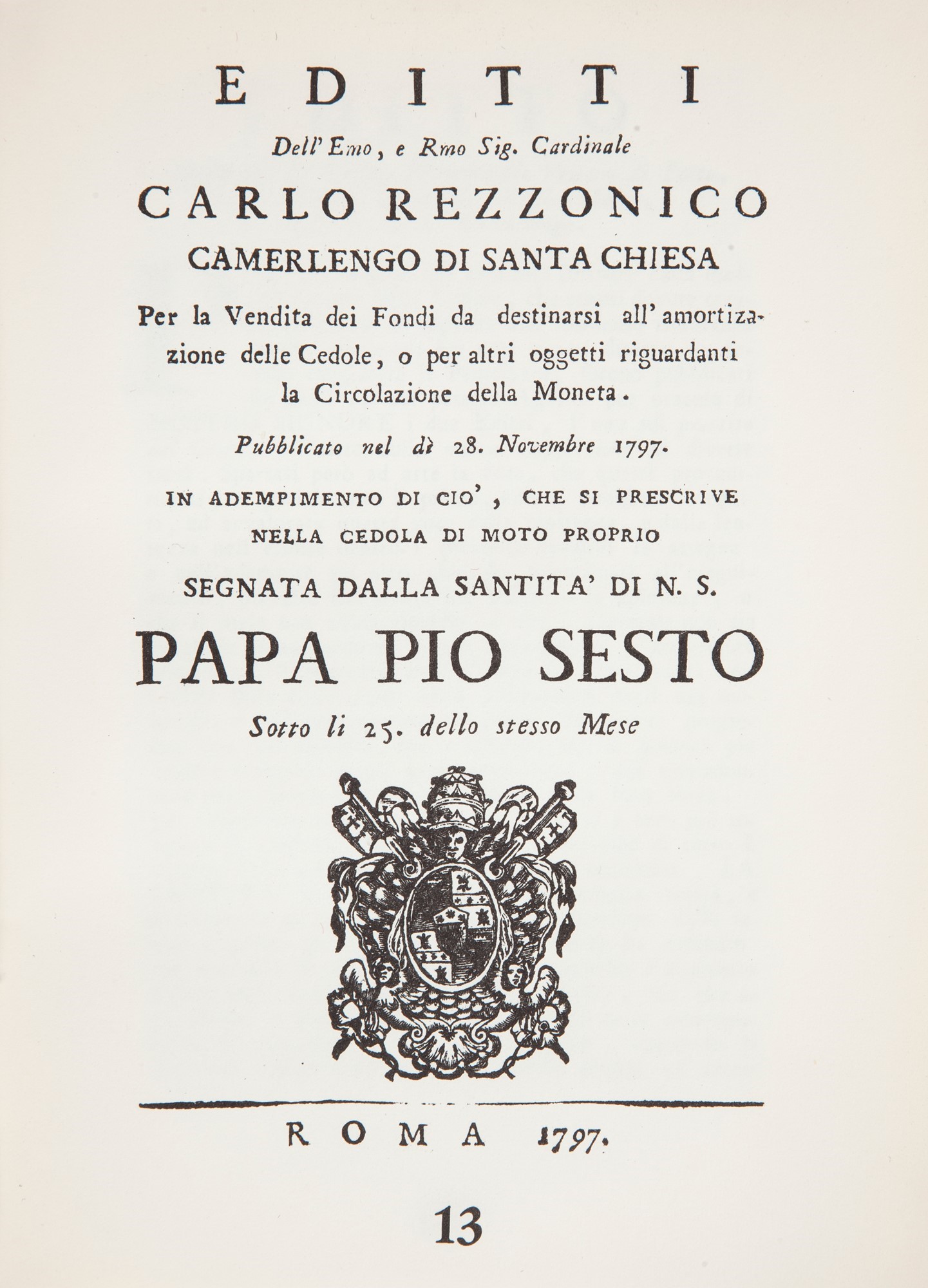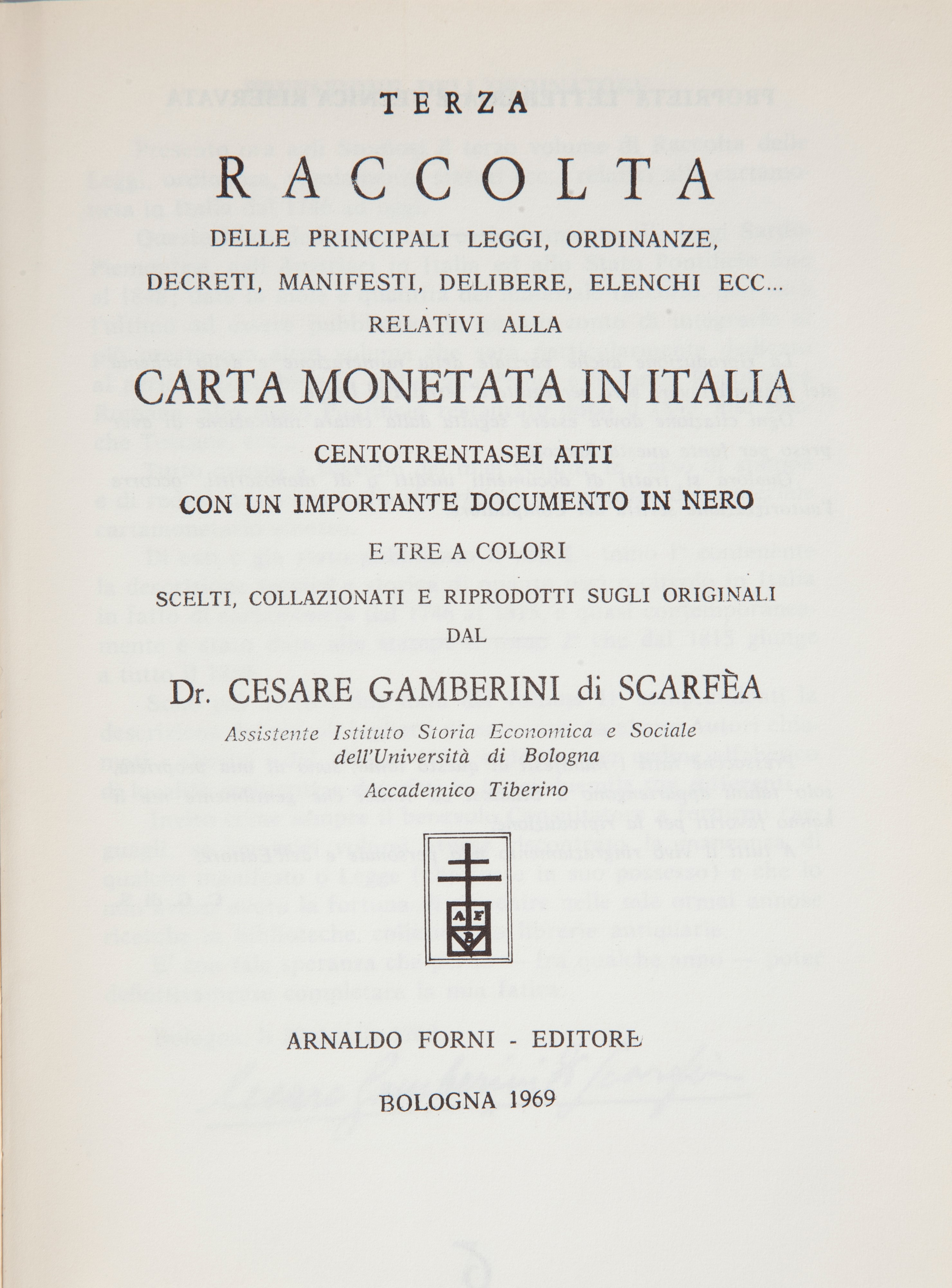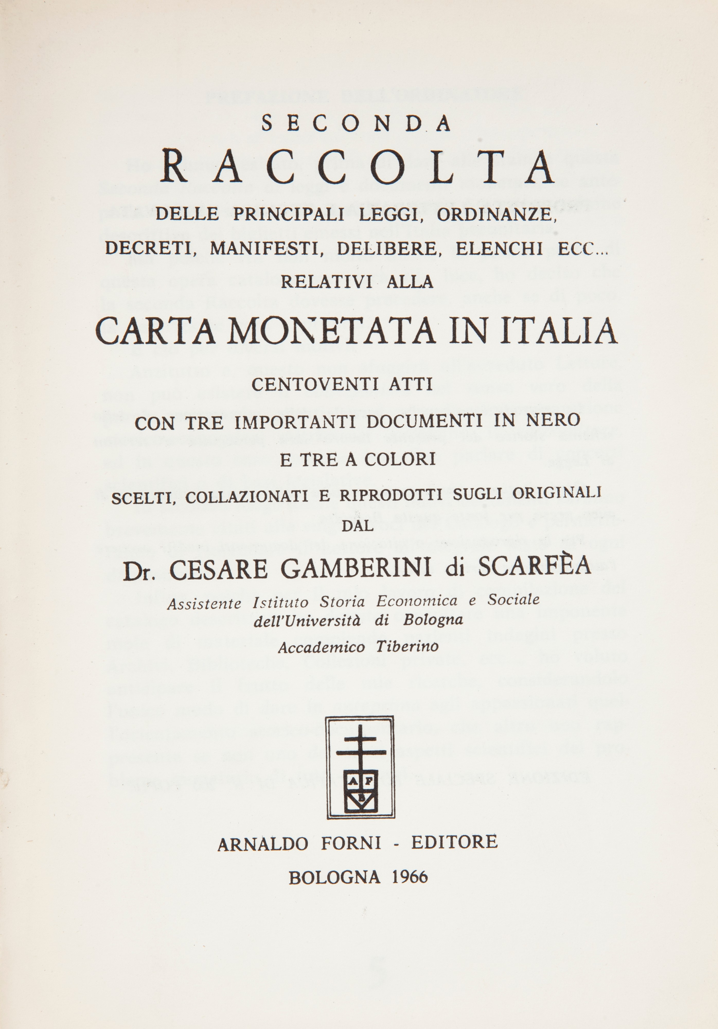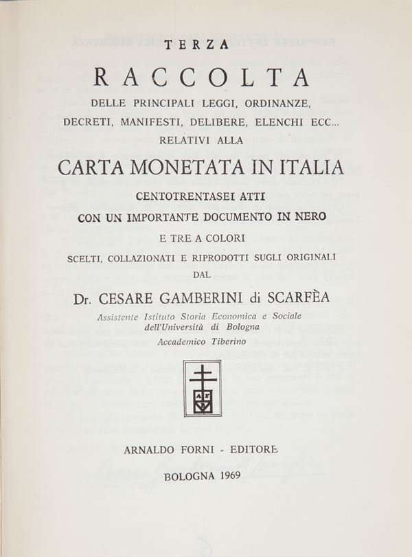 3 Volumi. Cesare Gamberini di Scarfea. Raccolta, Seconda raccolta e Terza Raccolta delle principali leggi, ordinanze, decreti, manifesti ecc. relativi alla Carta Monetata in Italia, Arnaldo Forni Editore, Bologna 1965-66-69