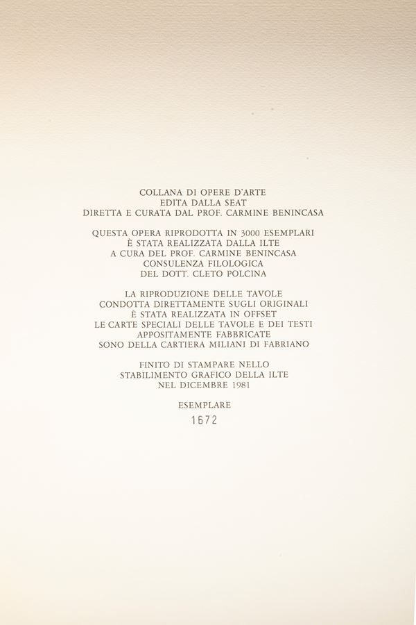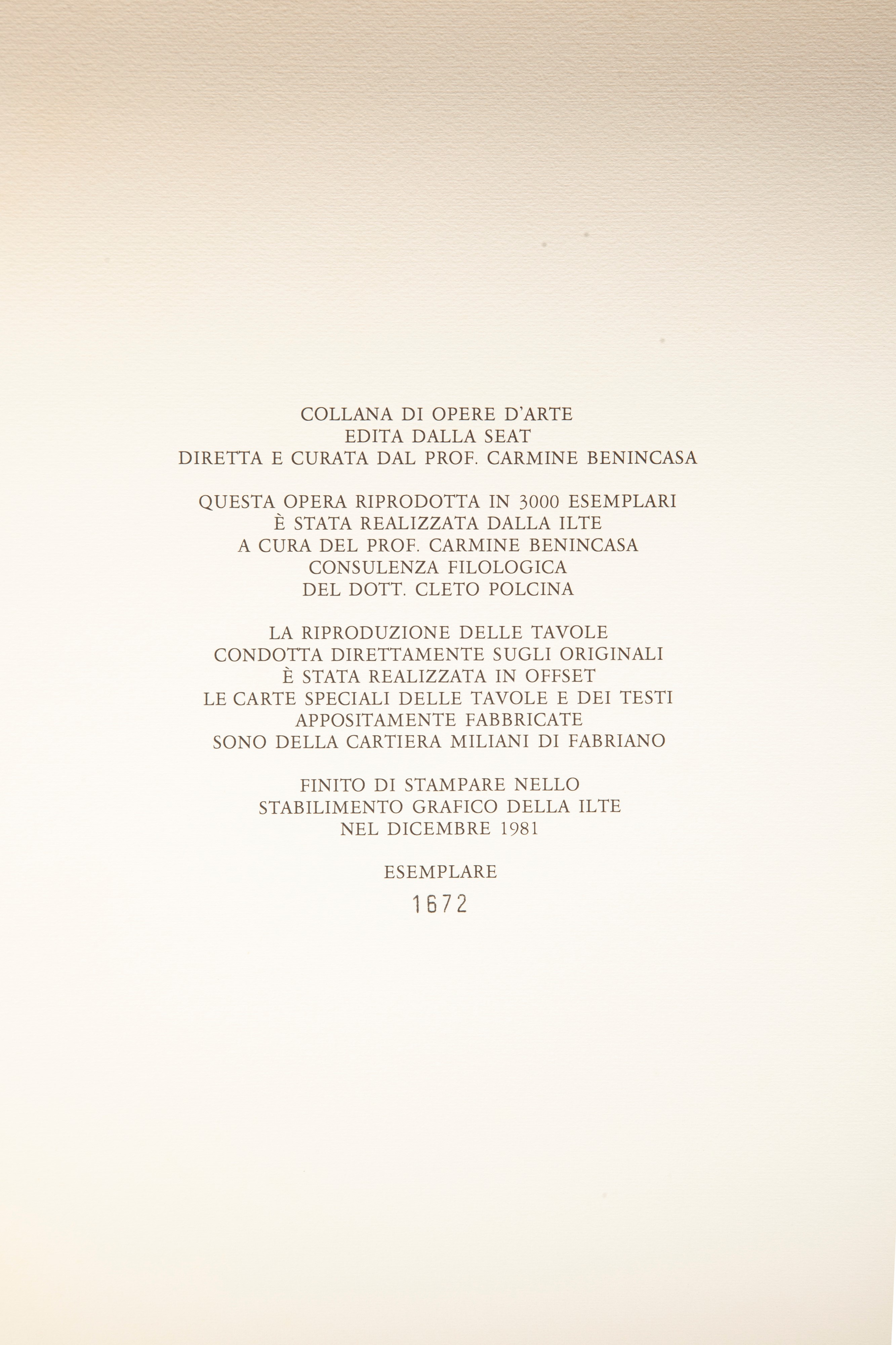 Tiratura limitata di 3.000 esemplari, ns. esemplare n. 1672. Entro cartella con 61 pagine di testo più indici. All'interno contiene tutte le 60 tavole a colori originali protette da veline. Carta speciale della cartiera Milani con cartella rivestita di tela.