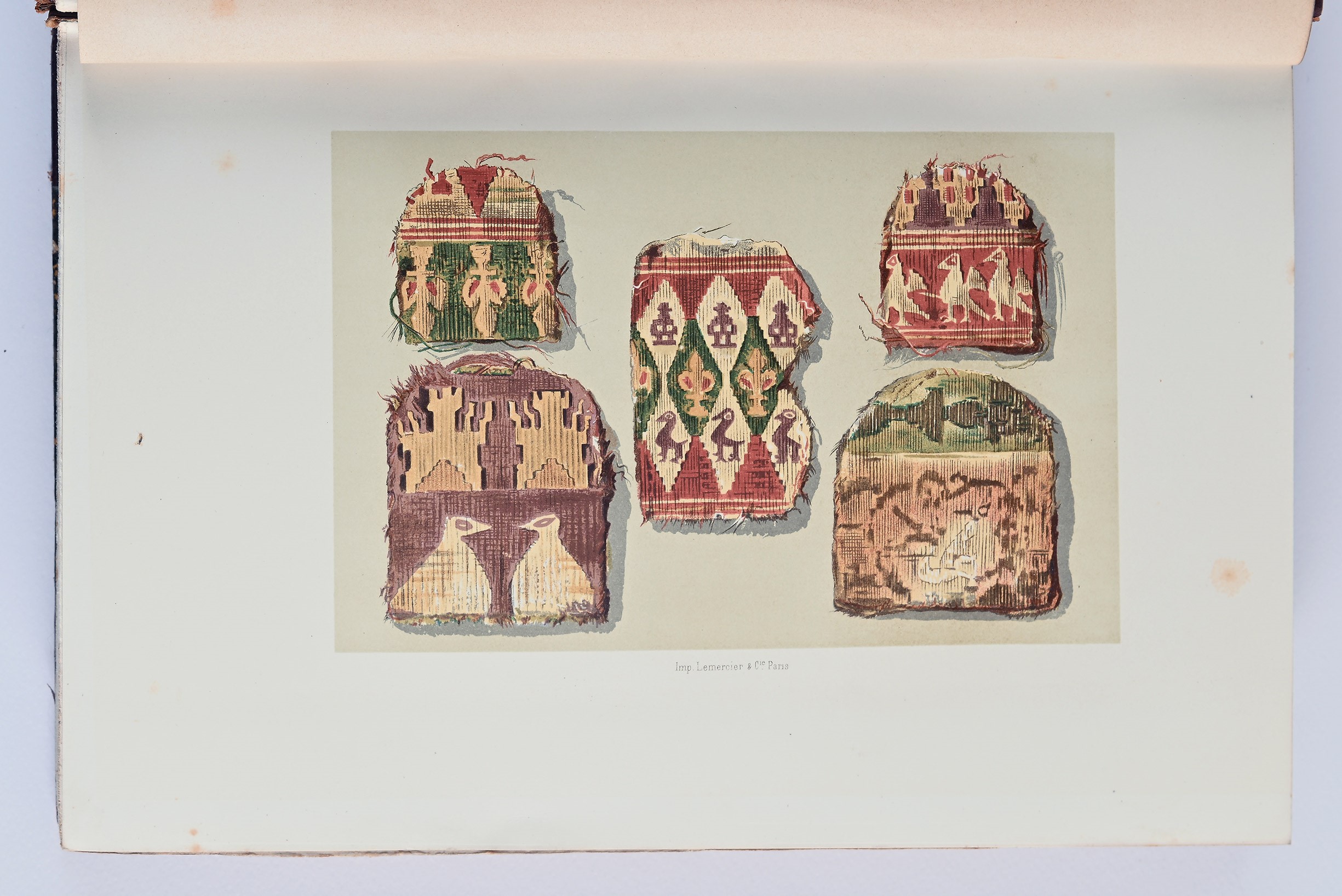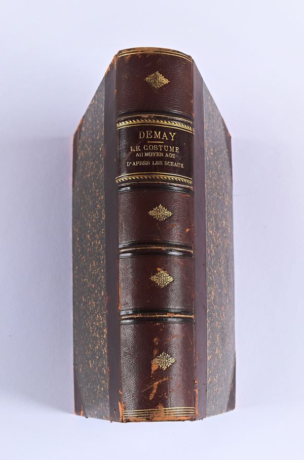 Prima edizione di questa interessante opera sull'abbigliamento, sull'araldica, sulle armi ed armature medievali, di Germain Demay archivista dell'Archivio Nazionale francese. Illustrata con 2 tavole cromolitografiche fuori testo e 567 figure dentro e fuori testo disegnate da P. Sellier. Legatura coeva in mezza pelle a 4 nervi con angoli in pelle, titolo e fregi in oro al dorso.
