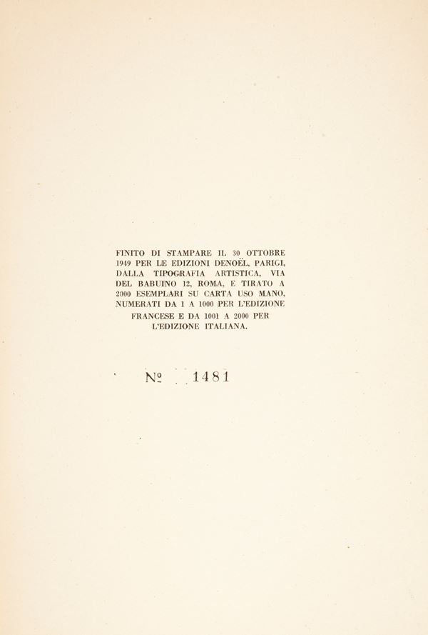 9 disegni nel testo e 30 tavole. Tiratura limitata a 2.000 esemplari numerati (da 1 a 1.000 nella versione francese e da 1.001 a 2.000 nella versione italiana), ns esemplare n. 1.481