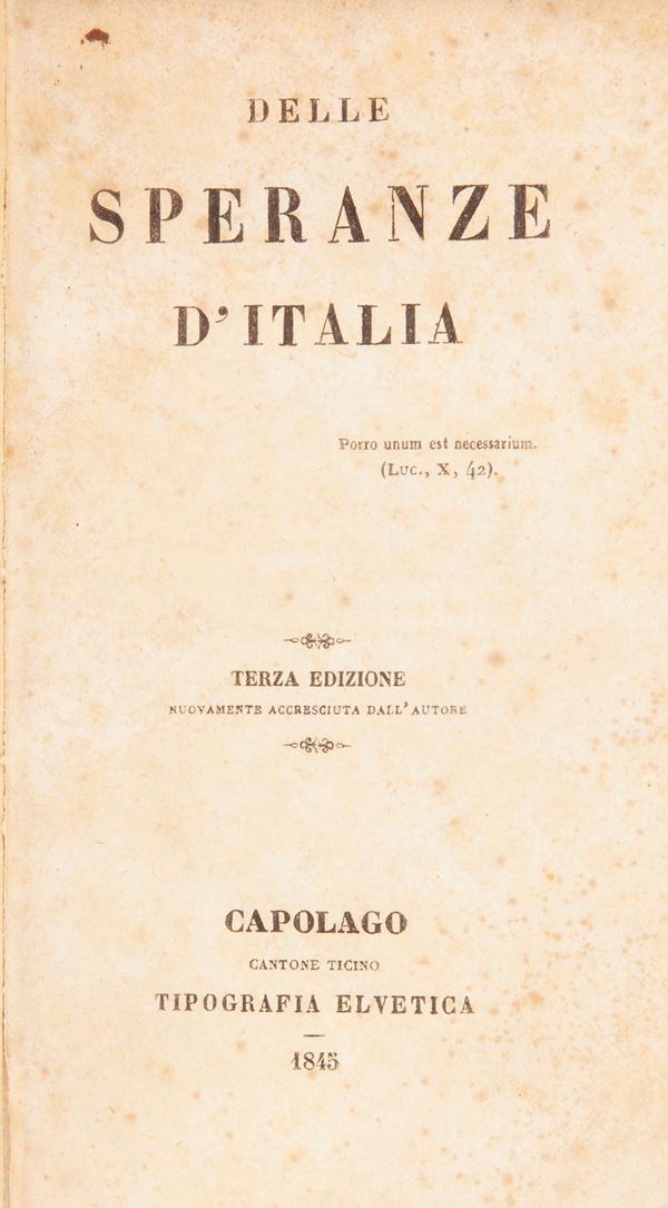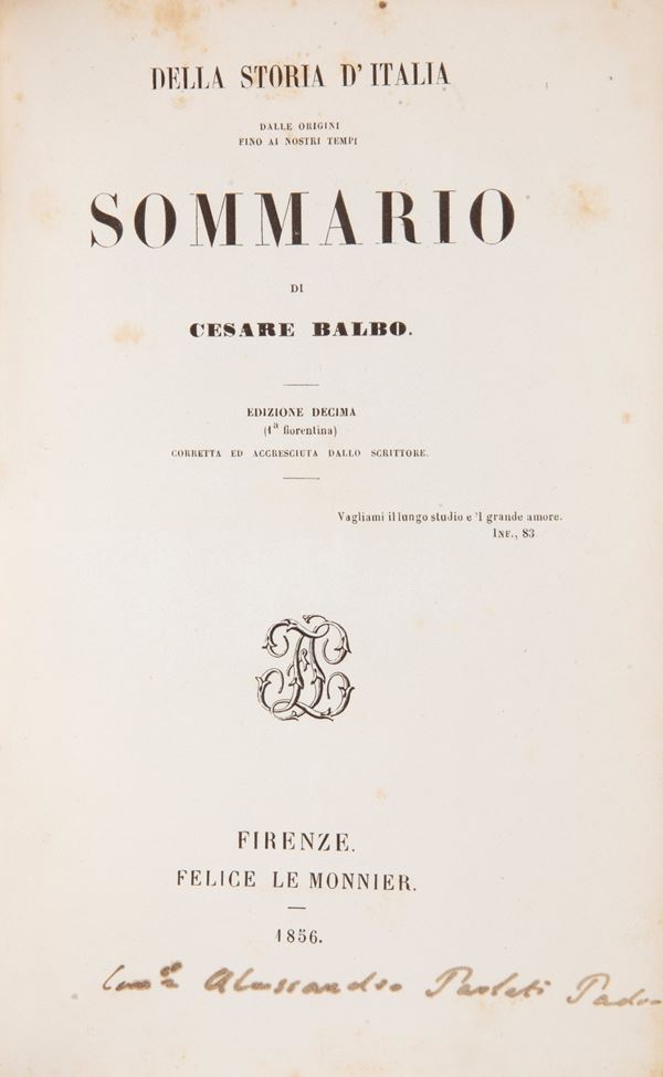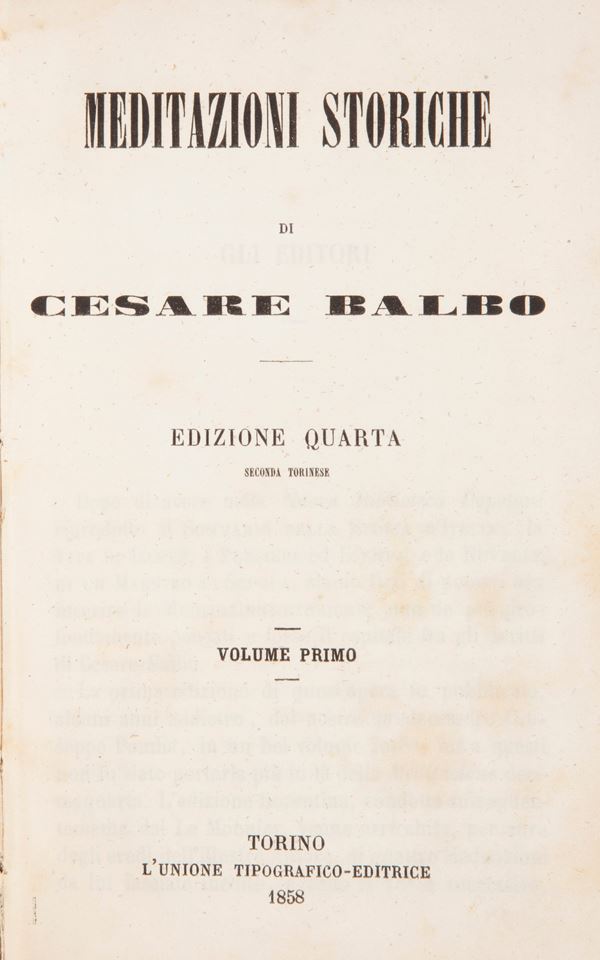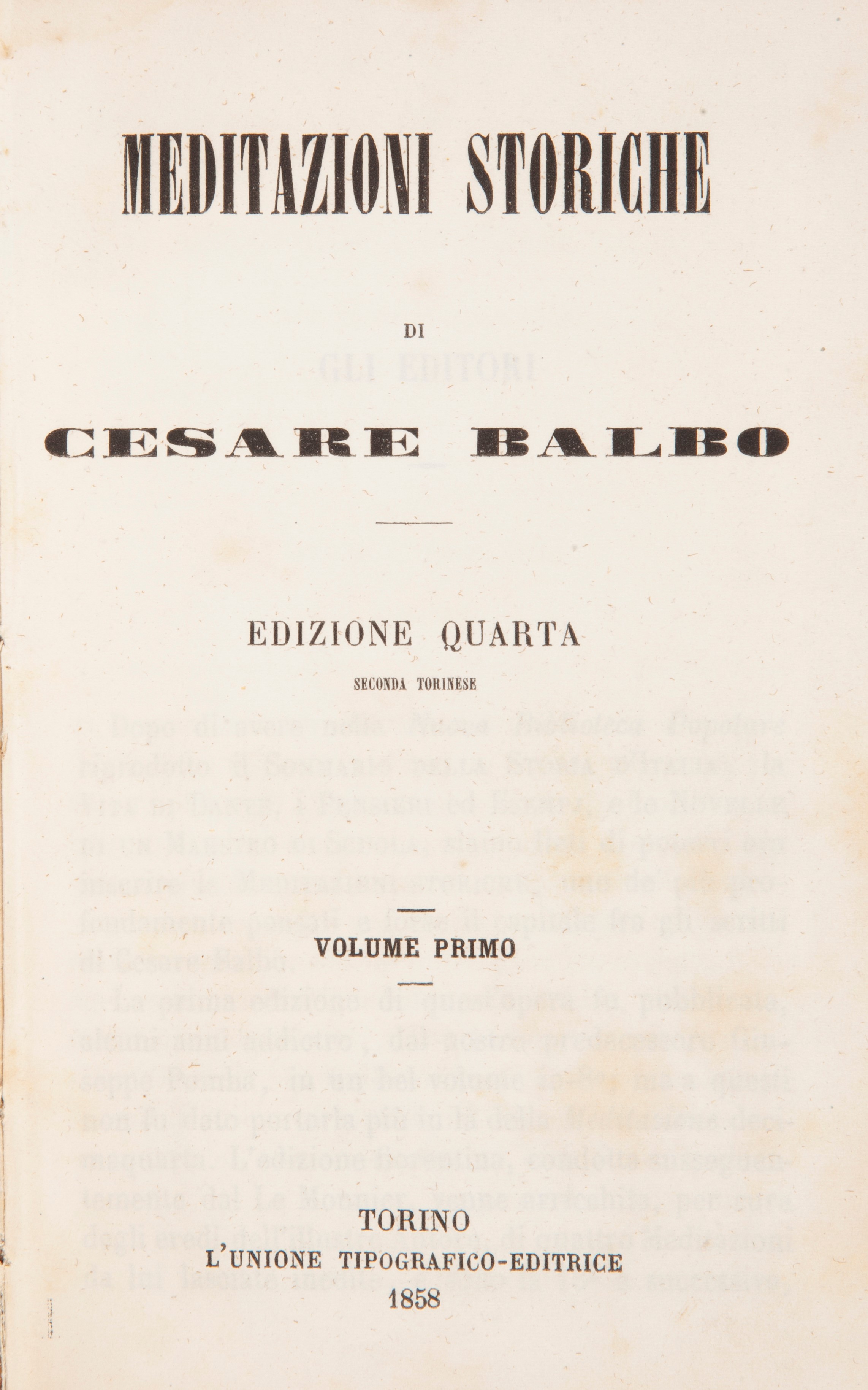 Tre opere di Cesare Balbo - Sommario della Storia d'Italia. Edizione decima, Le Monnier 1856; - Delle Speranze d'Italia, Terza edizione, Tipografia Elvetica, Capolago 1845; - Meditazioni storiche. Edizione quarta. Unione Tipografico-Editrice 1858 Volumi I-II;