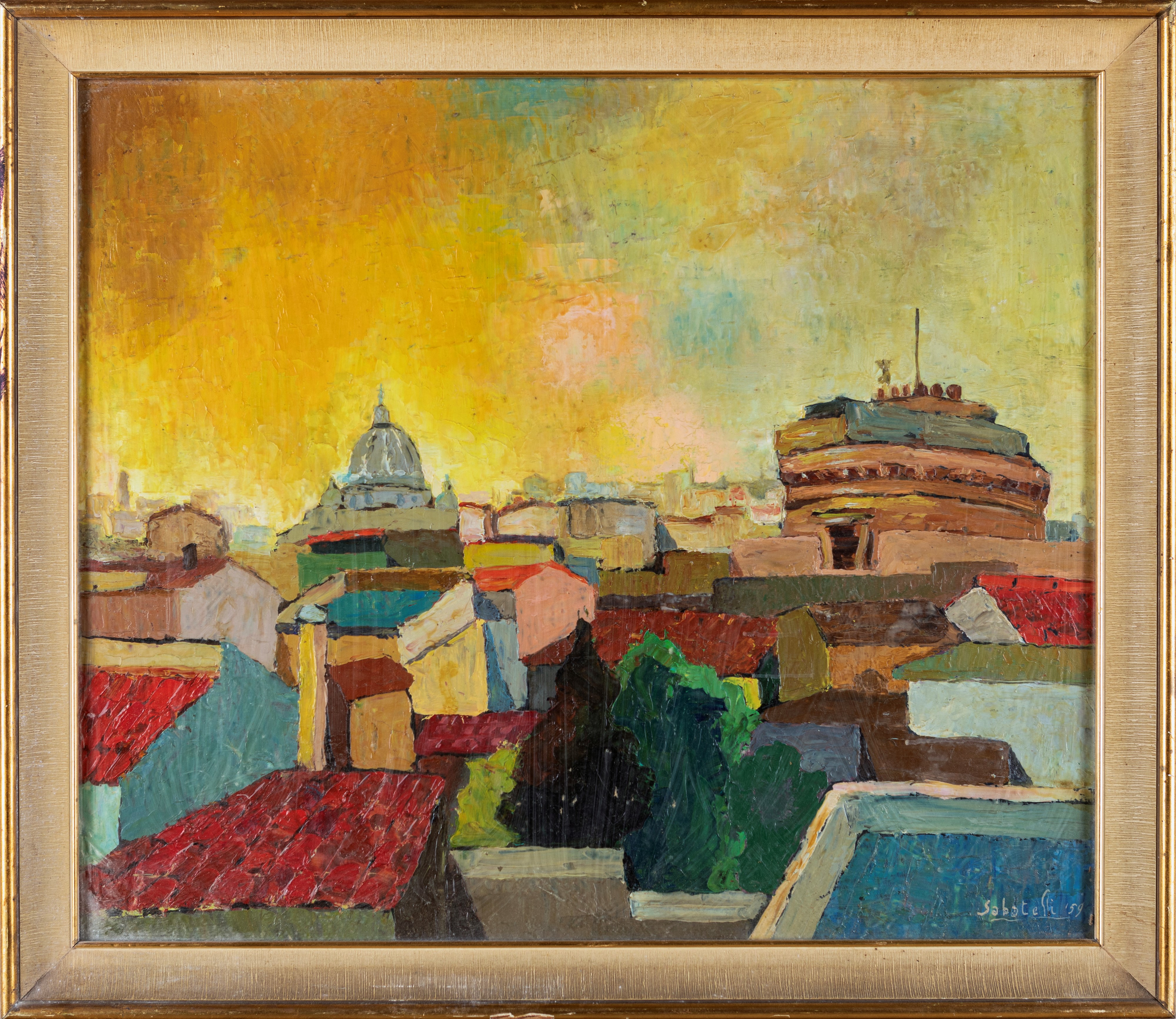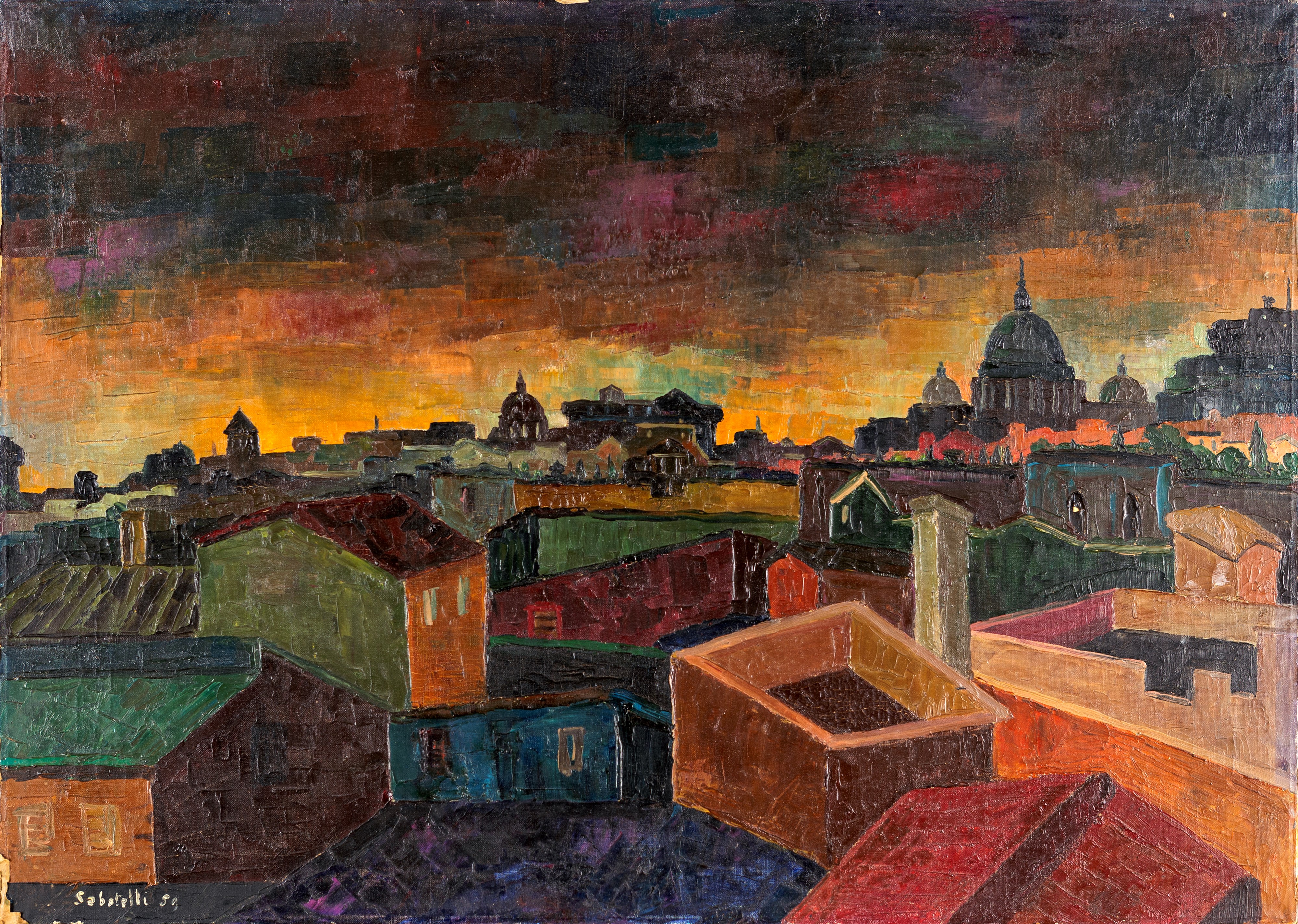 Coppia di dipinti - Tetti di Roma con San Pietro e Castel Sant'Angelo, 1959