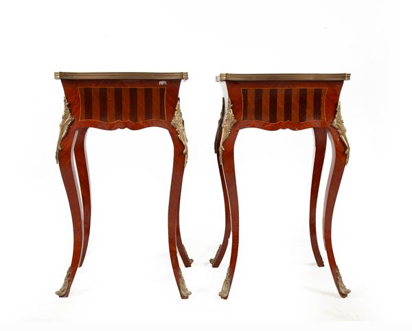 piano cinturato in metallo dorato, un cassetto nella fascia caratterizzato da tarsie a fasce verticali, lunghe gambe mosse