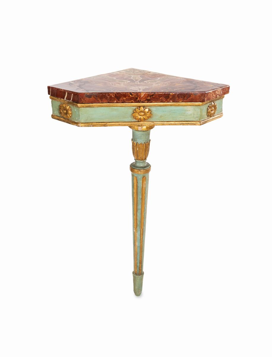 Coppia di consoles ad angolo in legno laccato verde, Italia centrale XVIII secolo