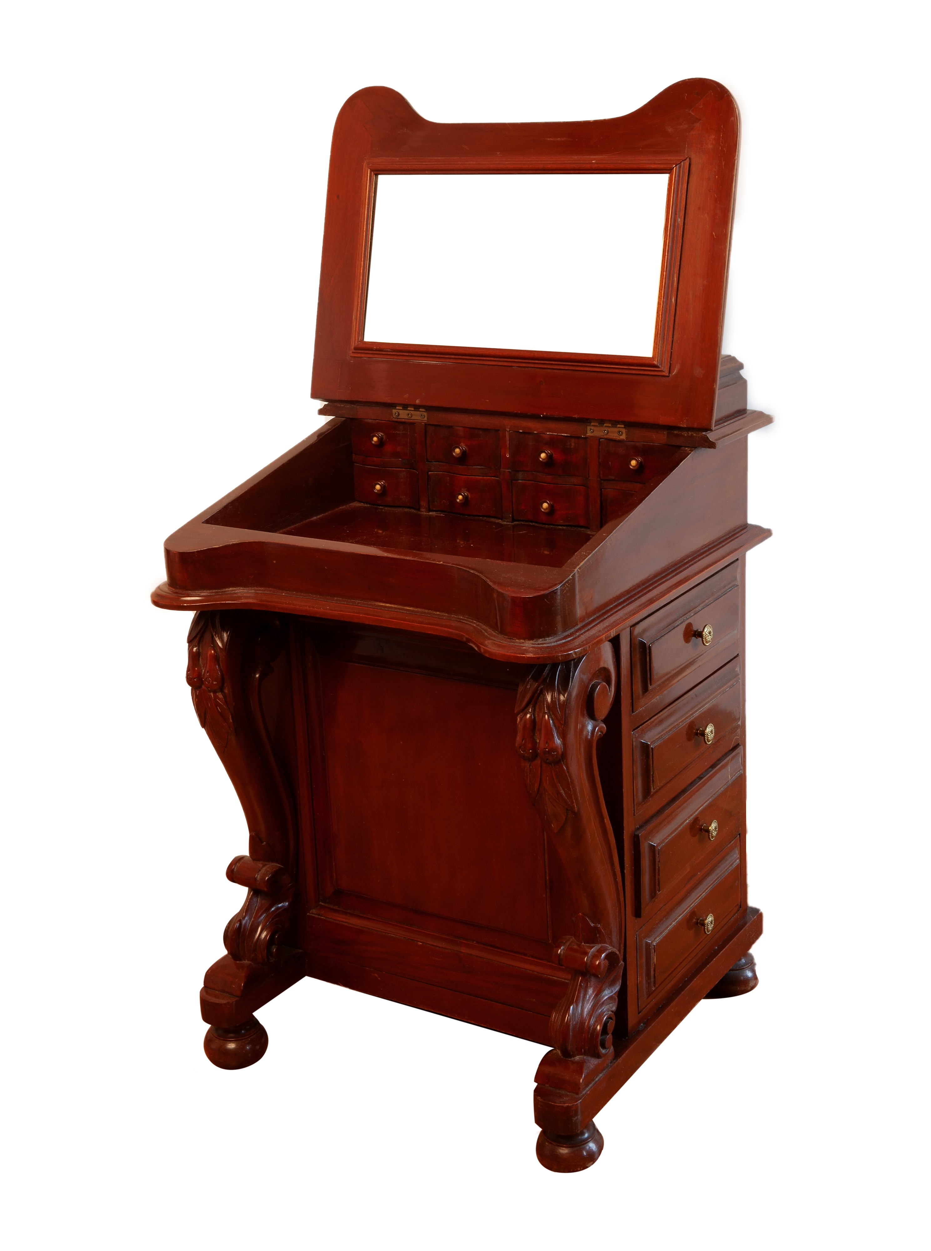 piano inclinato rivestito in pelle con specchio al verso e tiretti interni; quattro cassetti laterali disposti in colonna, montanti anteriori sagomati con estremità incurvate a ricciolo sottolineato da rilievi vegetali