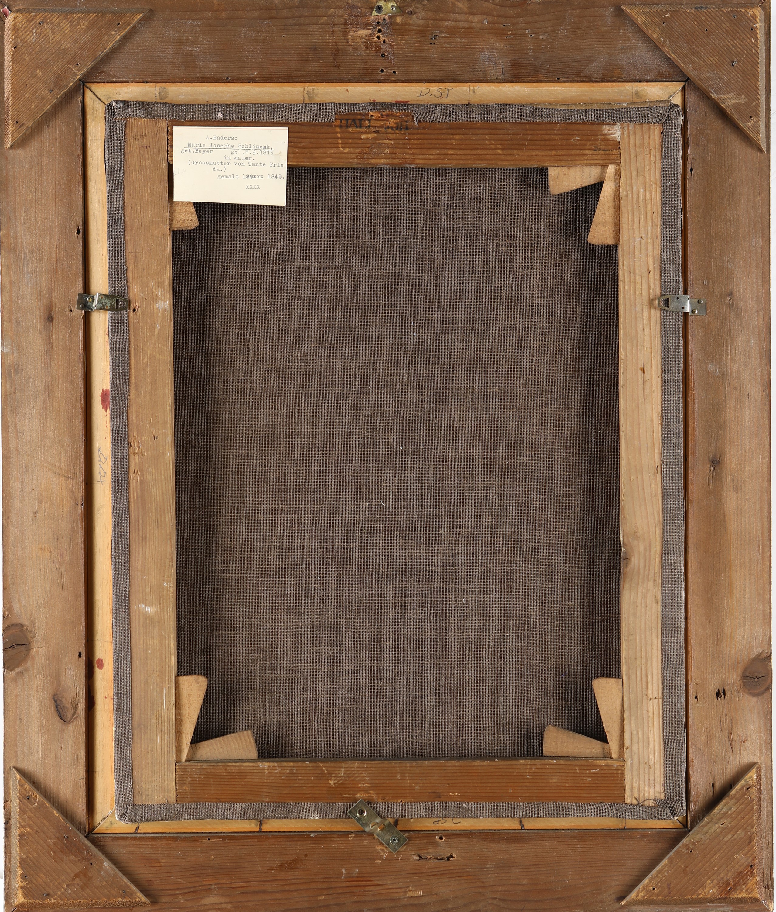 Al verso reca etichetta "A. Enders:/ Marie Josepha Schlimenk/ geb. Beyer geb. 8.9.1815/ (Grossmutter von Tante Frieda)/ gemalt 1849"