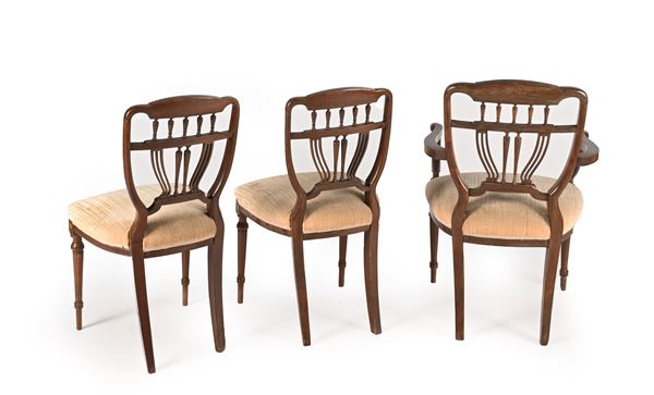 Poltroncina con balaustrini intarsiata e coppia di sedie en suite