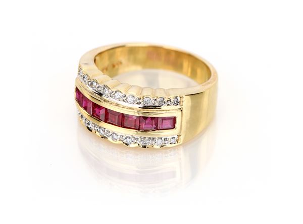 Oro giallo 750/000. Diamanti in taglio rotondo brillante e rubini in taglio carrè. Peso complessivo gr. 6,50