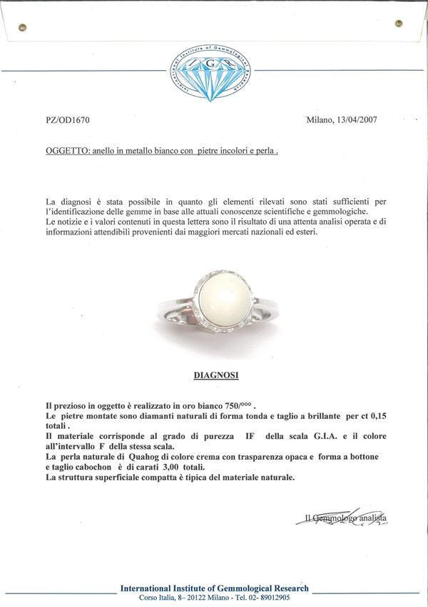 Oro bianco 750/000. Perla Quahog naturale spontanea ct. 3 mm 9x8. Diamanti in taglio rotondo brillante ct. 0,15, F, IF. Peso complessivo gr 5. Corredato di certificazione gemmologica IGR n° 1670