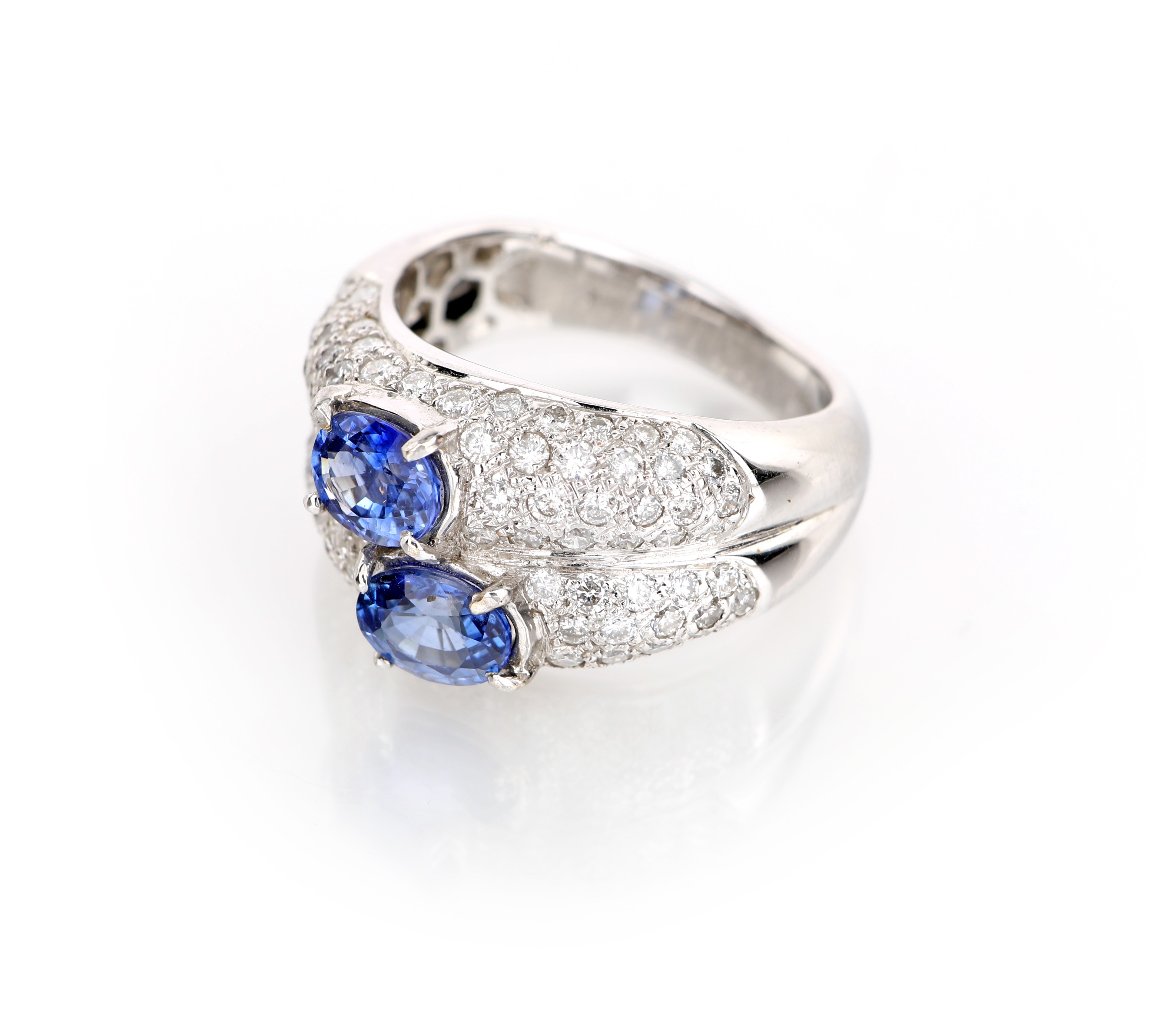 Oro bianco 750/000. Diamanti in taglio rotondo brillante ct. 1,50, zaffiri in taglio ovale ct. 2,20. Peso complessivo gr. 13
