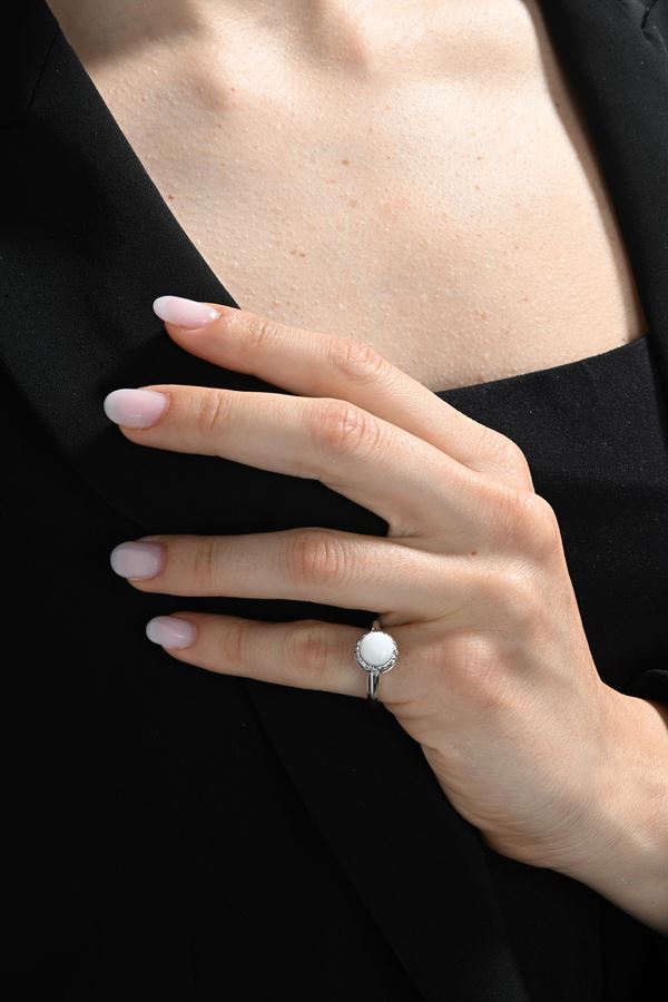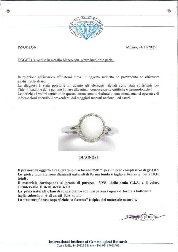 Oro bianco 750/000. Perla naturale spontanea Clam ct. 3,08. Diamanti in taglio rotondo brillante F, VVS 1.Peso complessivo gr 4,90.Corredato di certificazione gemmologica IGR 1356
