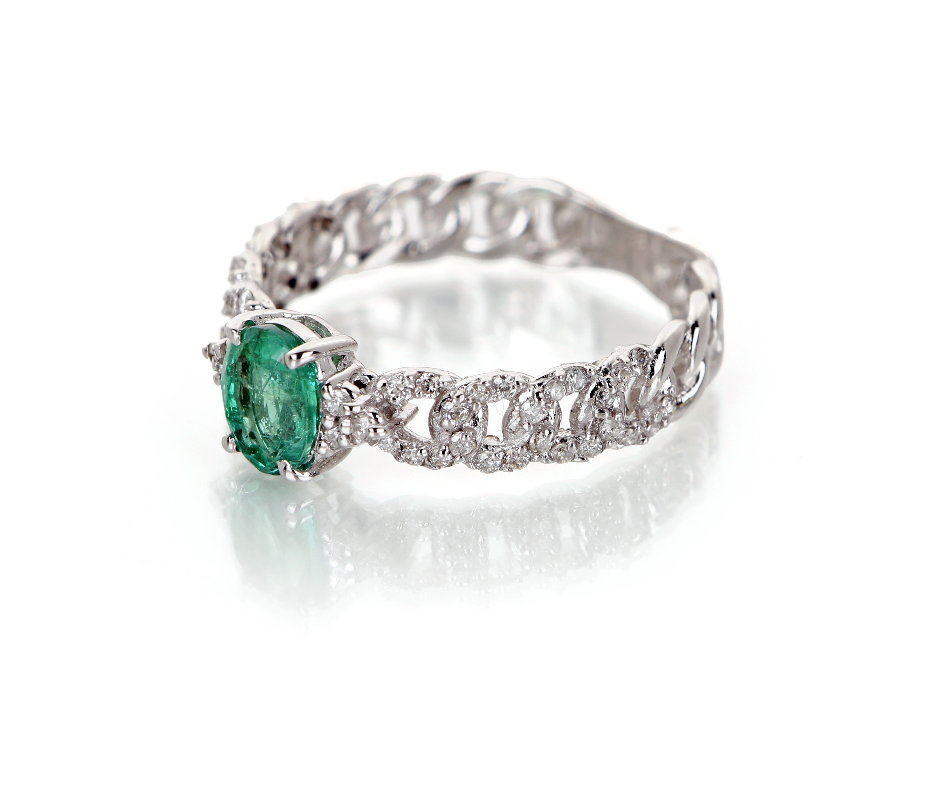 Oro bianco 750/000. Diamanti in taglio rotondo brillante ct. 0,40 ca. , smeraldo in taglio ovale ct. 1 ca. Peso complessivo gr. 3
