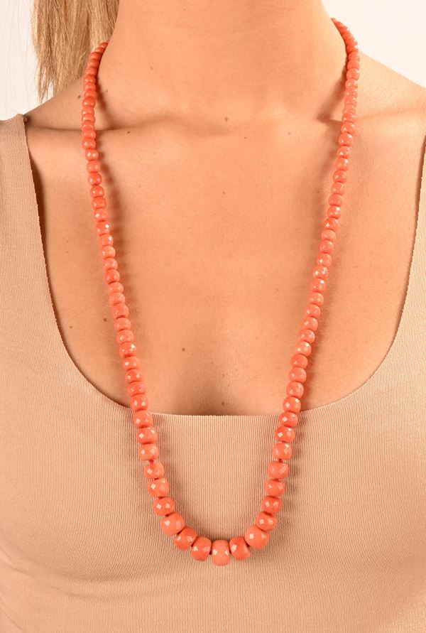 Oro giallo 750/000, corallo rosso in taglio sfaccettato da mm. 6 a mm. 12. Peso complessivo gr. 74,50