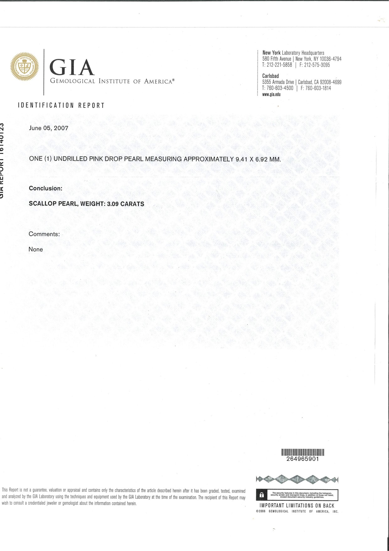 Oro giallo 750/000. Peso complessivo gr 7,50. Perla naturale spontanea Scallop ct 3,09. Diamanti in taglio rotondo brillante ct 0,20 ca. , G, VVS. Corredato di certificazione gemmologica GIA n° 16140123