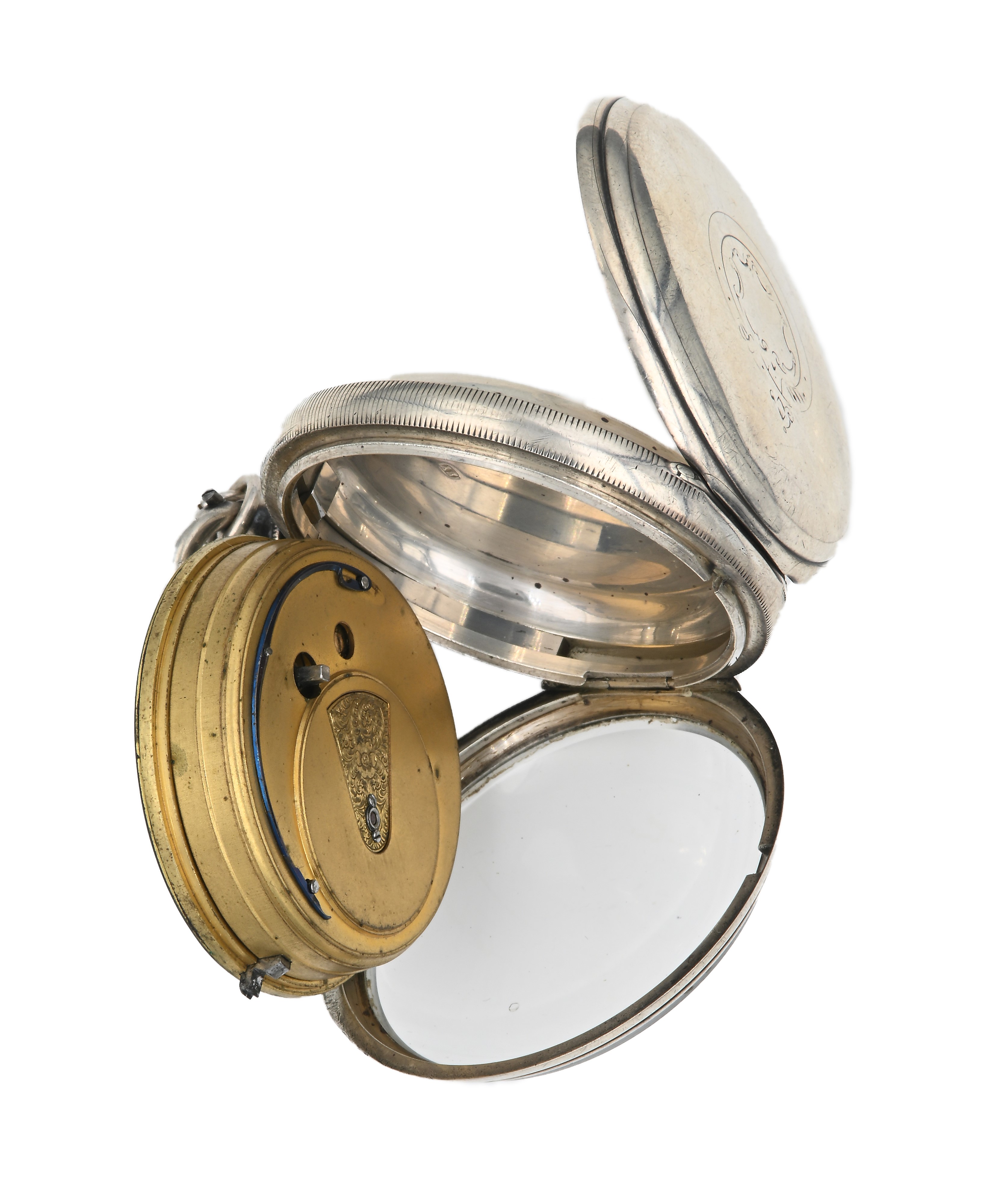 Funzionante. Meccanismo firmato e numerato 43375. Casse numerate 43375. Parapolvere in ottone. Catena in metallo con chiavetta