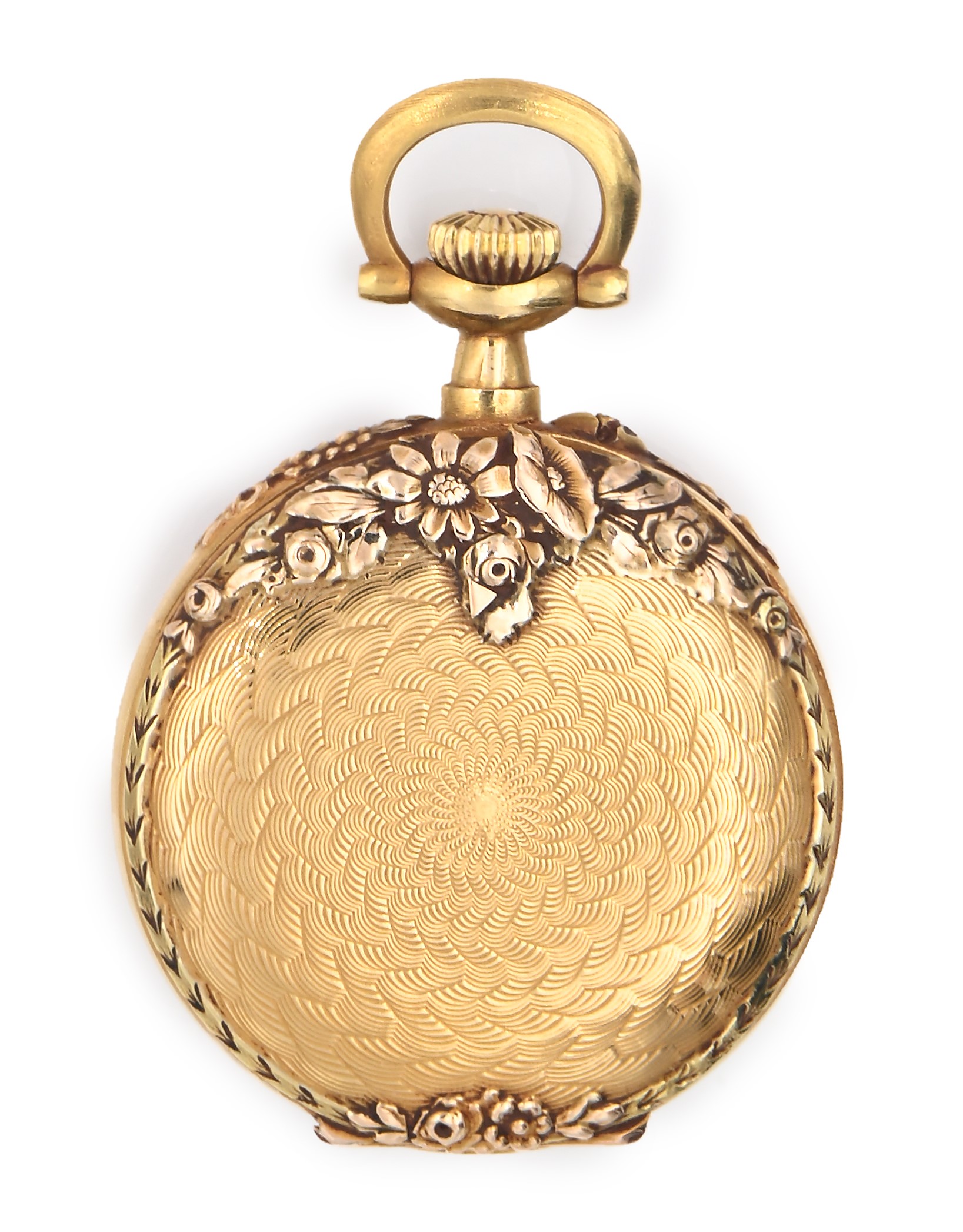 Lip - Orologio da tasca monachina remontoir con cassa in oro a più colori incisa e sbalzata. Scappamento ad ancora, bilanciere monometallico con spirale piana, 1920-30