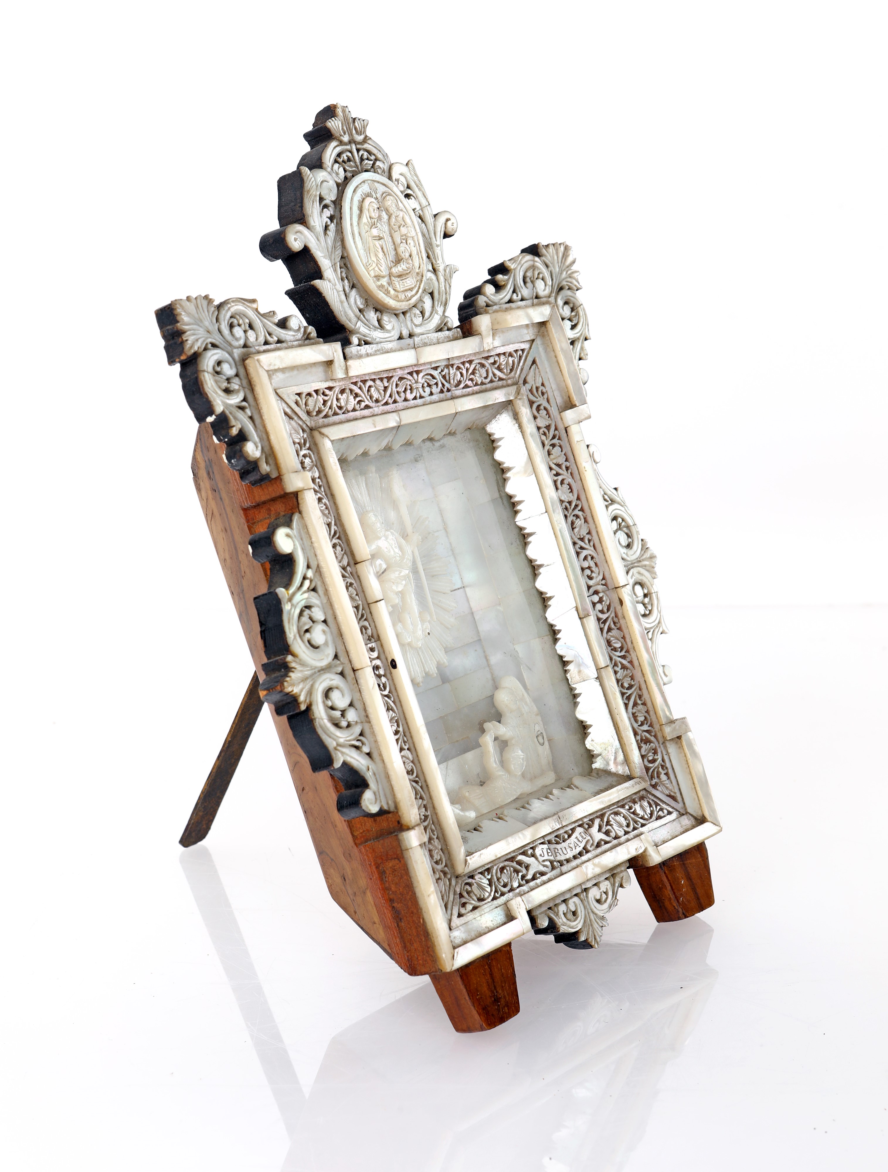 Altarolo in legno di ulivo e madreperla intagliata, arte sacra della Terra Santa, prima metà del XX secolo