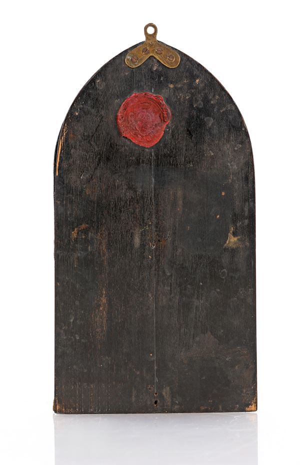 raffigurante Madonna col Bambino e San Giovannino; supporto in legno con profilo percorso da passamaneria dorata e due piccoli ornamenti in metallo a forma di corolla stilizzata e di colomba. Al verso timbro in ceralacca. Lievi difetti