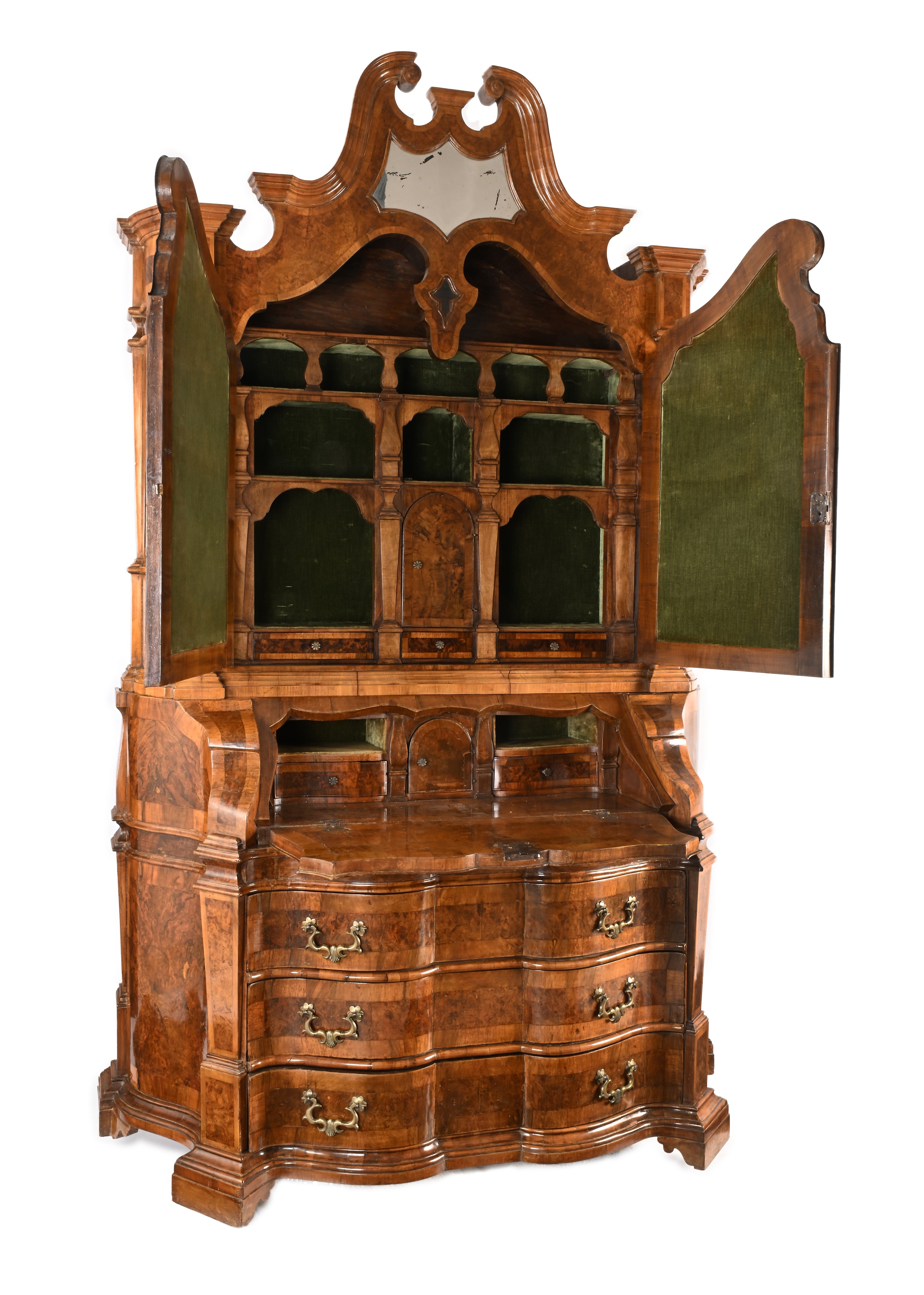 corpo mosso di linea trapezoidale con parte superiore coronata da cimasa a timpano spezzato e due sportelli con specchi che celano quattro ripiani suddivisi in scomparti ed uno sportello centinato con tre cassetti allineati sottostanti; corpo inferiore con facciata a balestra delimitata da paraste angolari suddivisa in tre cassetti sormontati da ribalta con antina centrale affiancata da un vano con tiretto sottostante disposti en pendent. Piedi a mensola. Difetti, restauri e rifacimenti