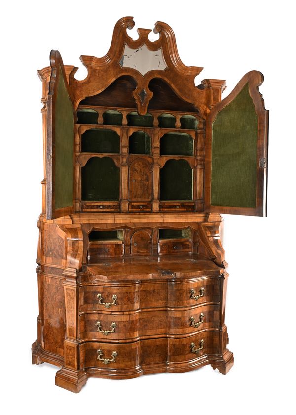 Cassettone a ribalta con alzata in noce e radica, Veneto, XVIII secolo