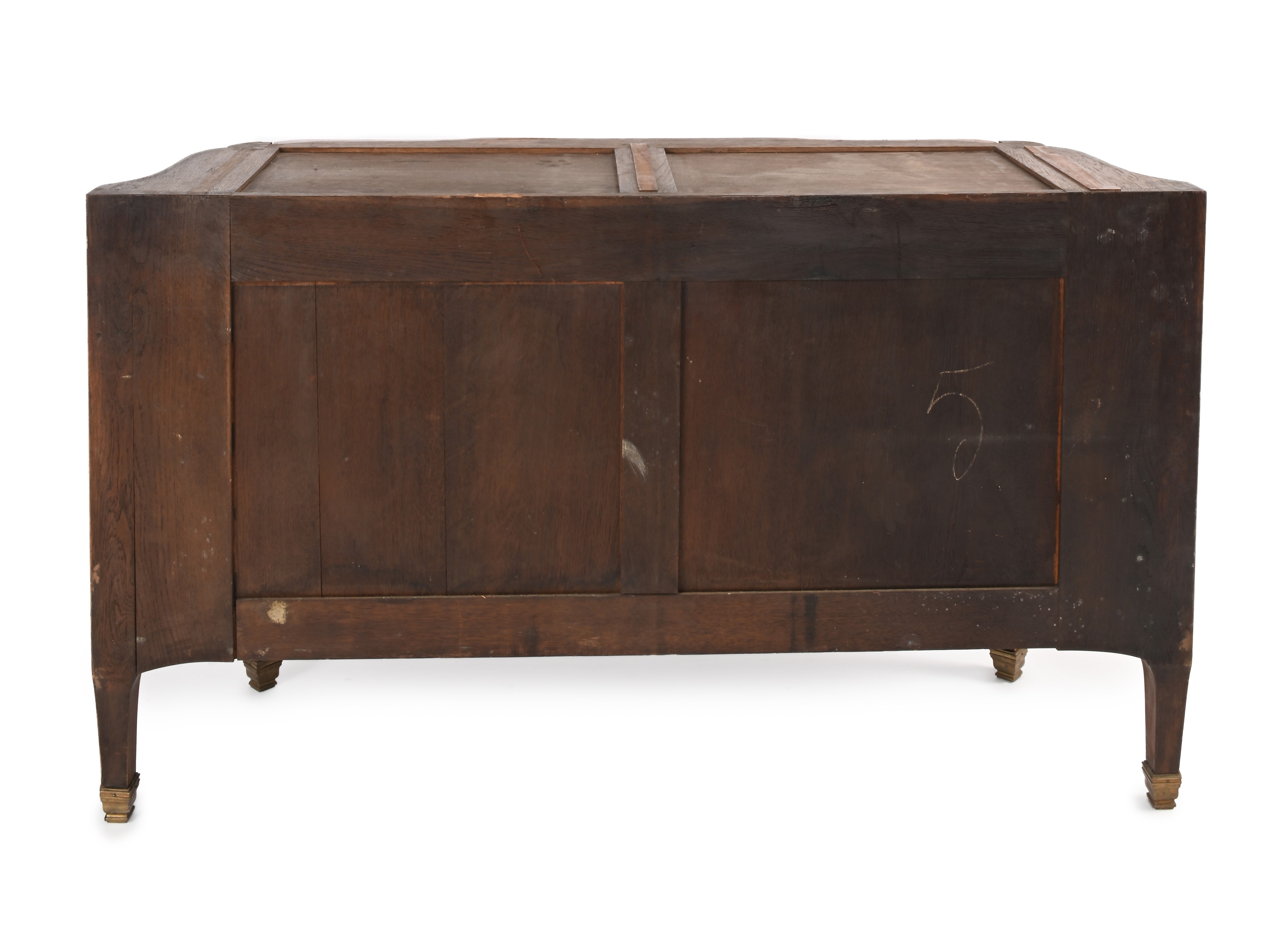 piano sagomato in marmo, un cassetto nella fascia e due sottostanti privi di traversa decorati da un grande intarsio centrale in legni di frutto raffigurante un cesto di fiori, affiancato da trofei d'armi e strumenti musicali; piedi rastremati calzati di puntali in bronzo dorato