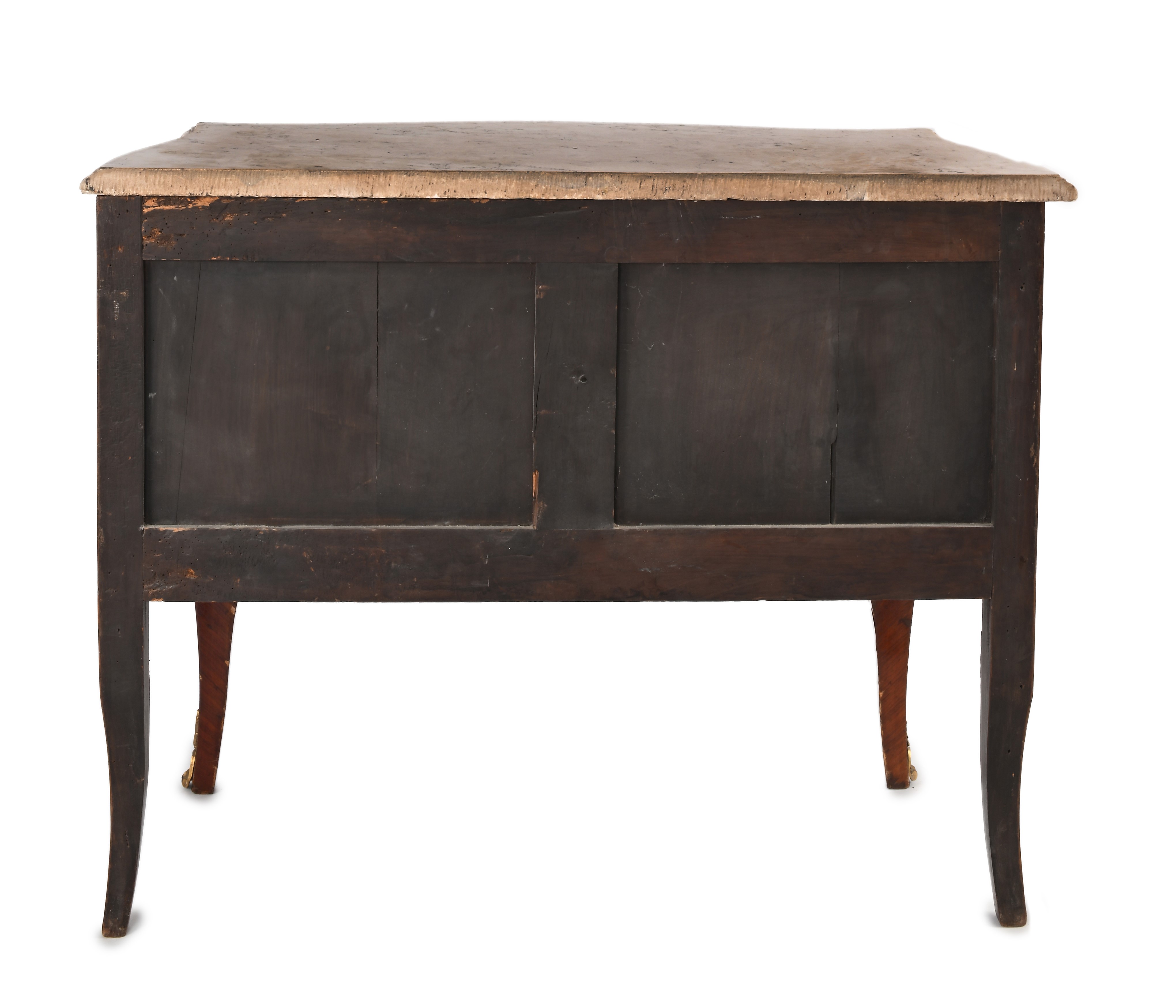piano sagomato in marmo, facciata lievemente convessa scandita da due cassetti con tralci di fiori intarsiati, bocchette, maiglie e finiture ornamentali in bronzo dorato; gambe sfuggenti