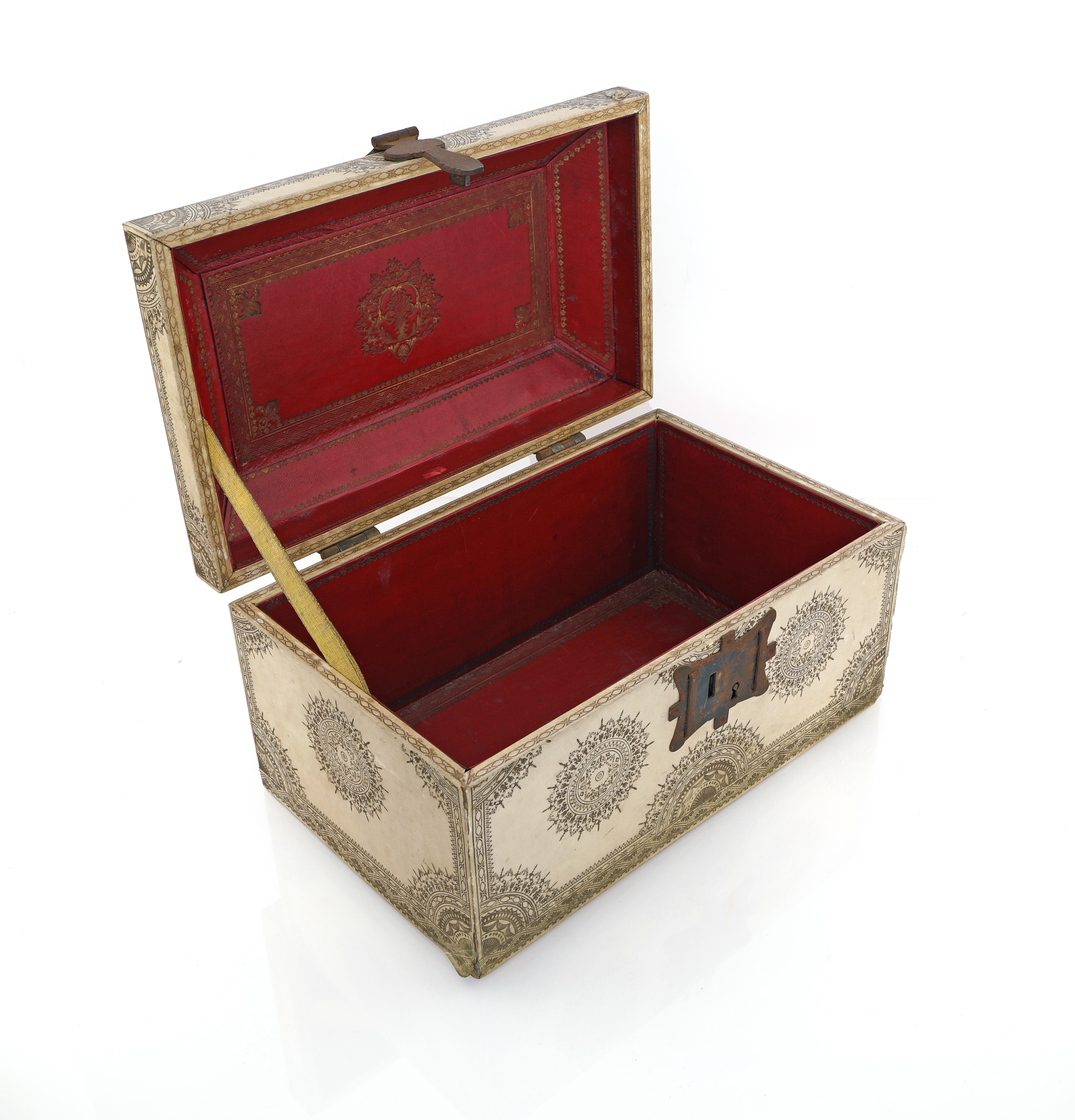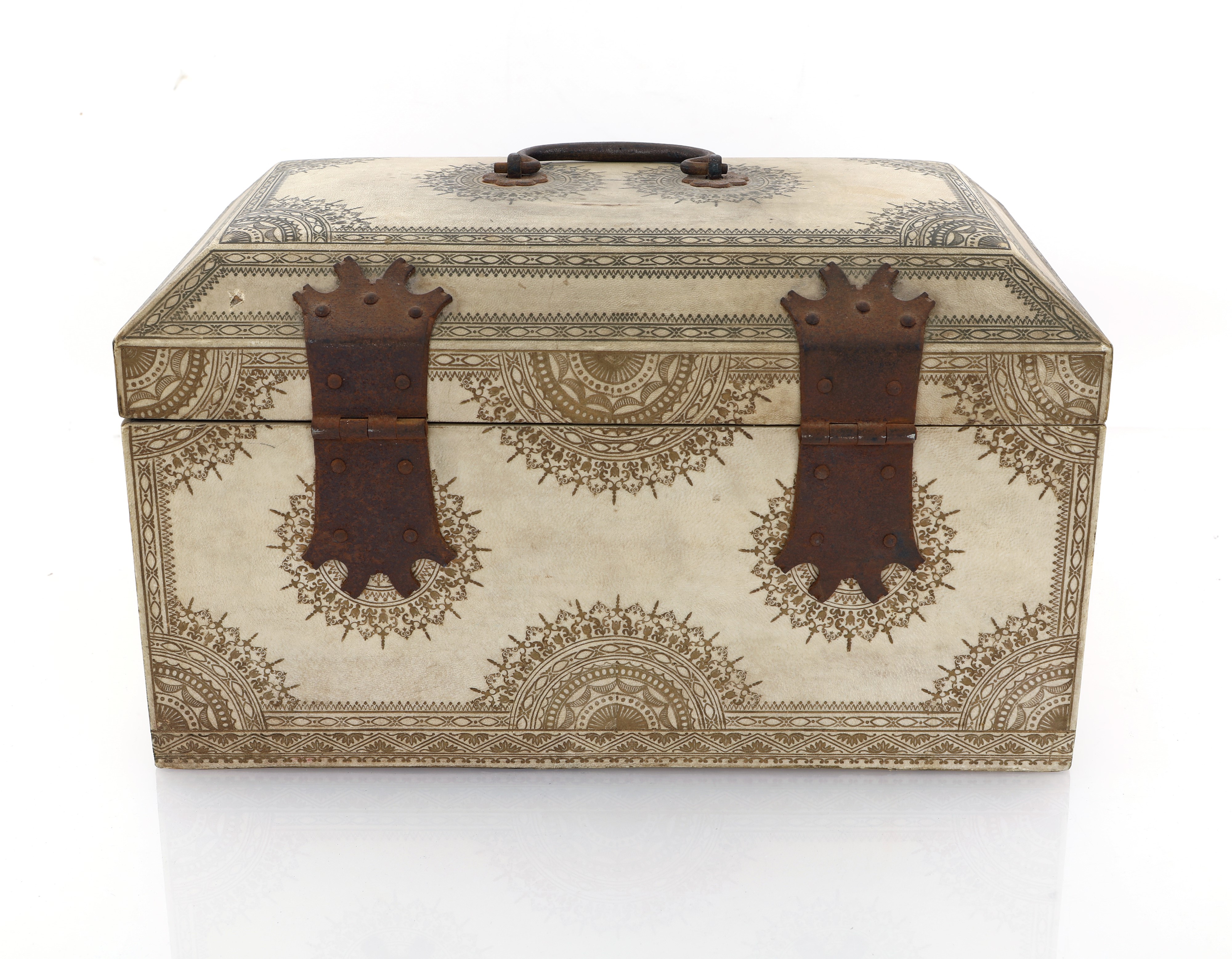 Cofanetto stile arabo normanno in legno rivestito in pergamena e cuoio, Maison Chalmette, Parigi, fine XIX/inizi XX secolo