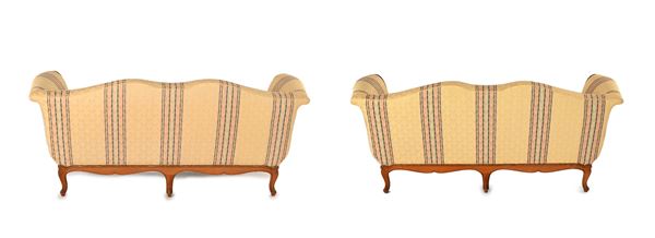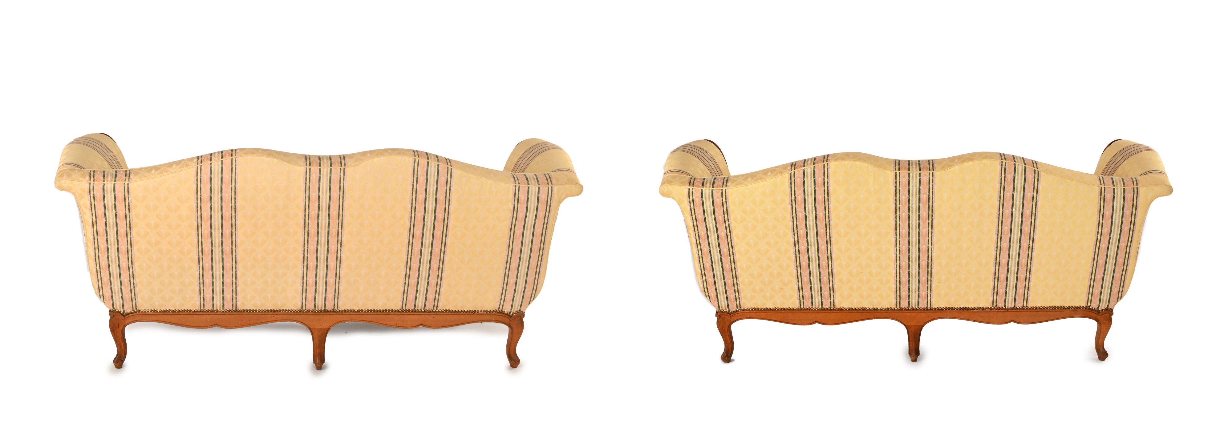 Coppia di divani in noce, interamente imbottiti e rivestiti in tessuto a righe, fine XIX/inizi XX secolo