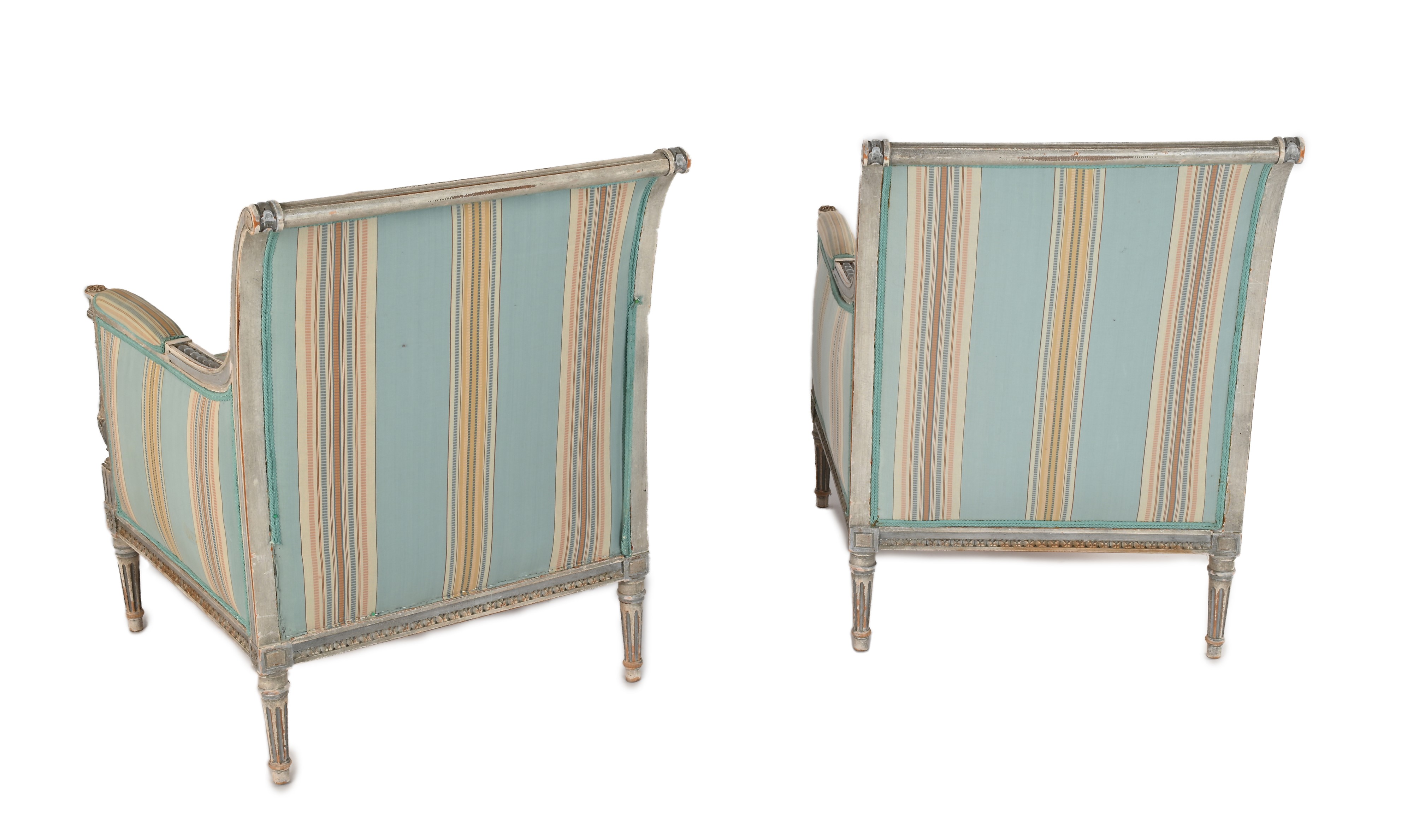 Coppia di poltrone in legno laccato azzurro chiaro, XX secolo