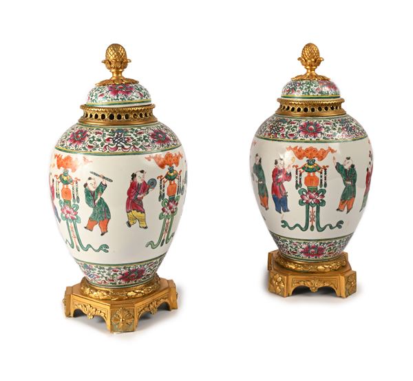 Coppia di potiches in porcellana e bronzo dorato, Canton, XIX secolo