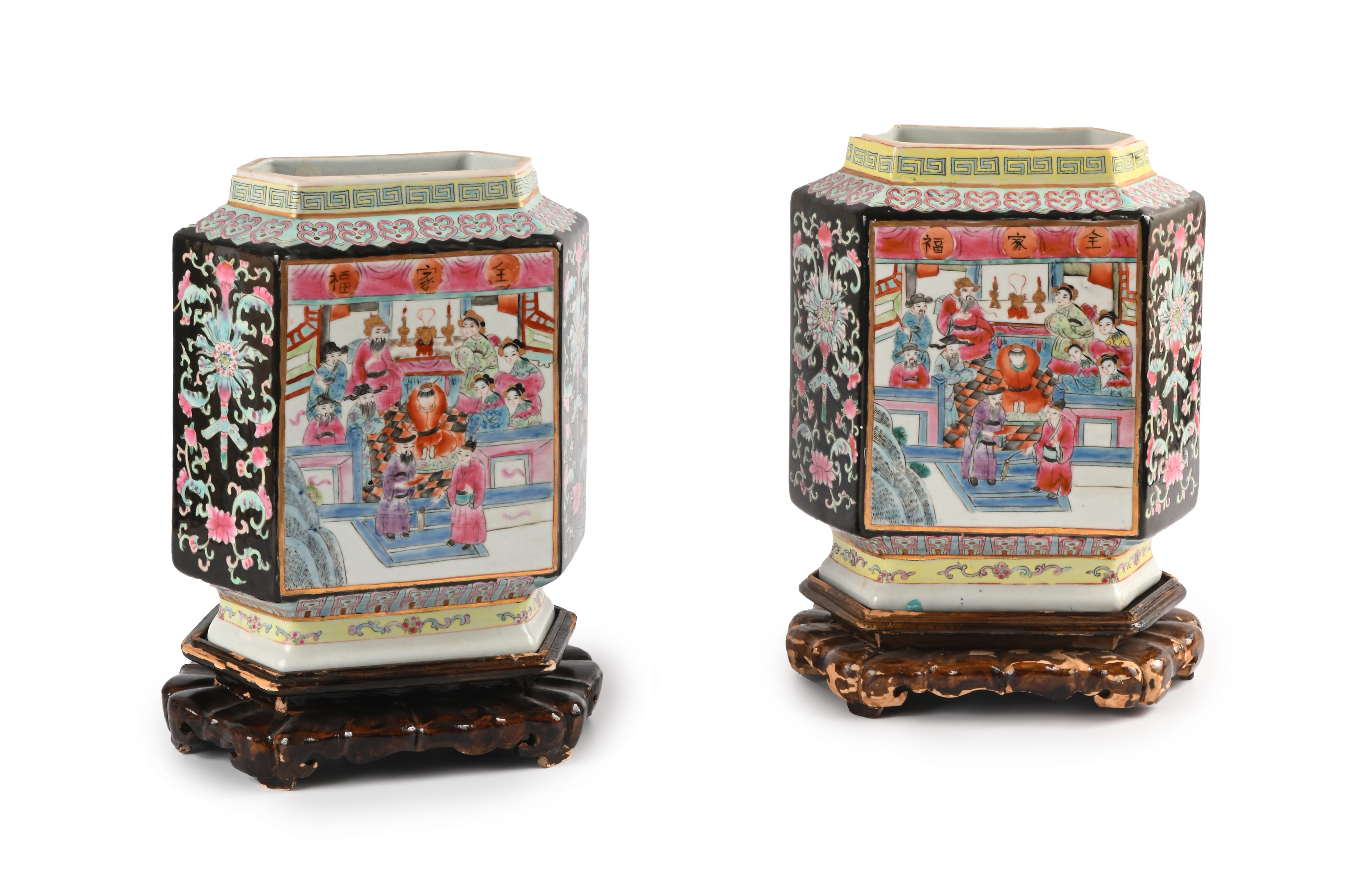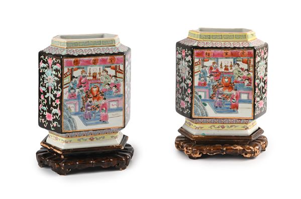 corpo poliedrico a pianta esagonale, decorato sulle facce principali da scene di genere animate da numerosi personaggi e da composizioni di peonie su fondo nero; collo percorso da greca su fondo giallo. Basi in legno. Marchio apocrifo in rosso sotto la base