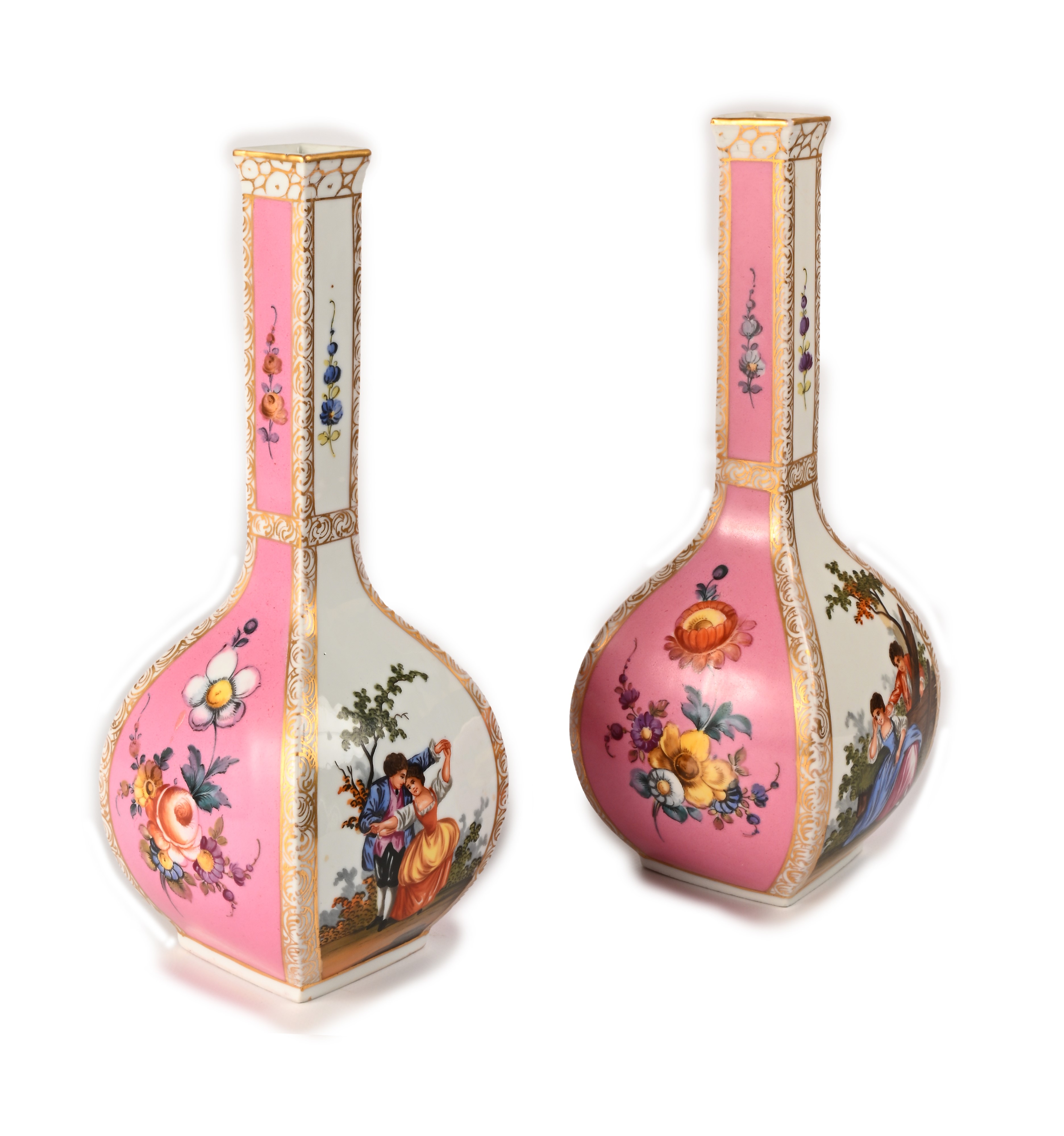 corpi a pianta squadrata con lungo collo, decorati da scene galanti alternate a grandi composizioni di fiori su fondo rosa