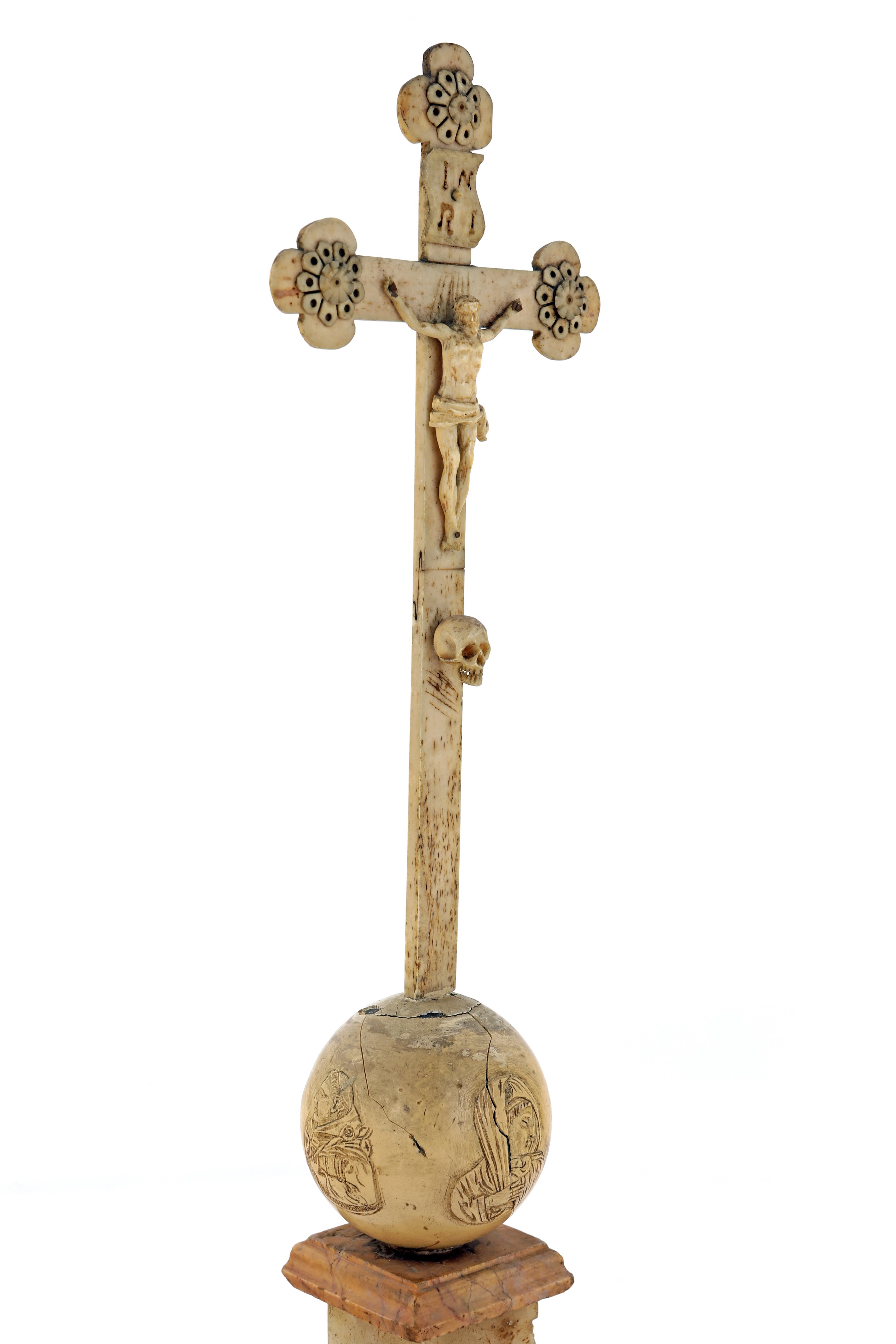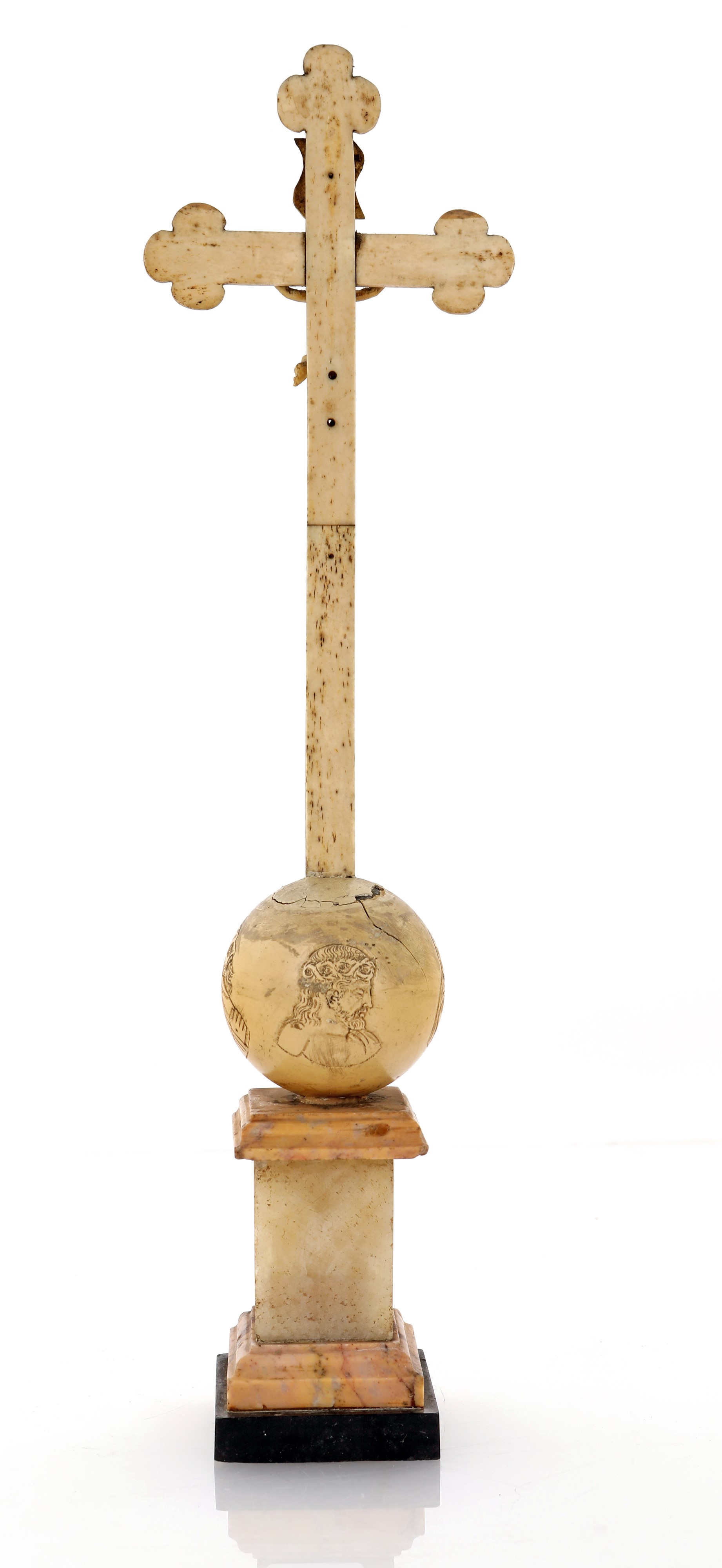 Crocifisso in osso su piedistallo in alabastro e marmi giallo e nero, XIX/XX secolo