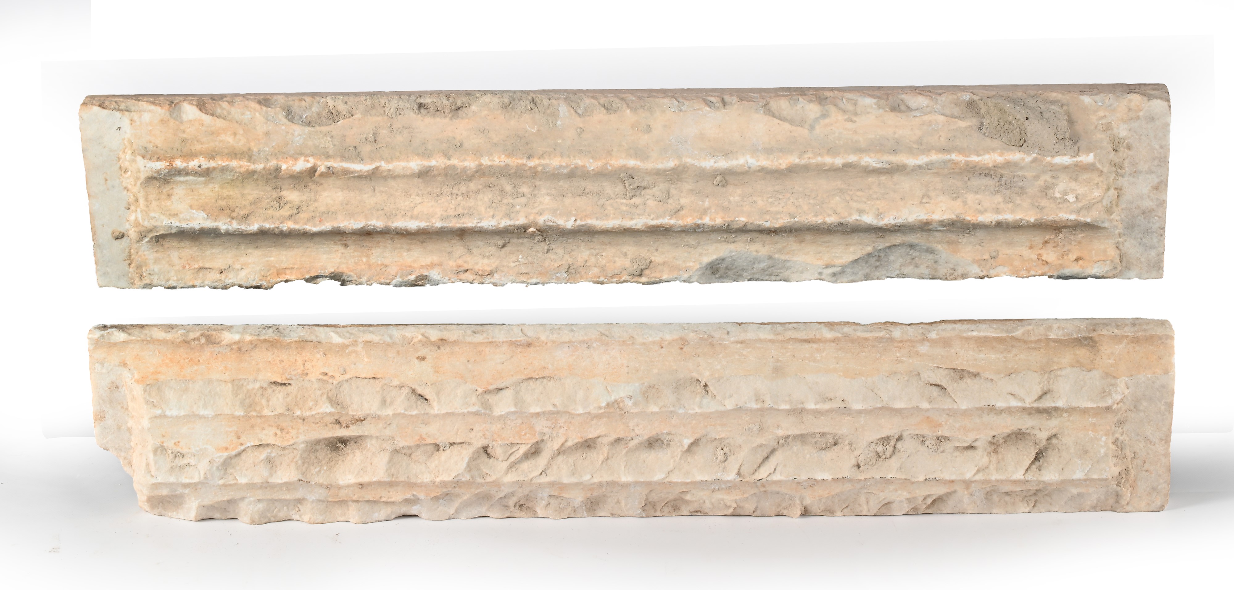 Due antiche lesene in marmo bianco con intarsi cosmateschi