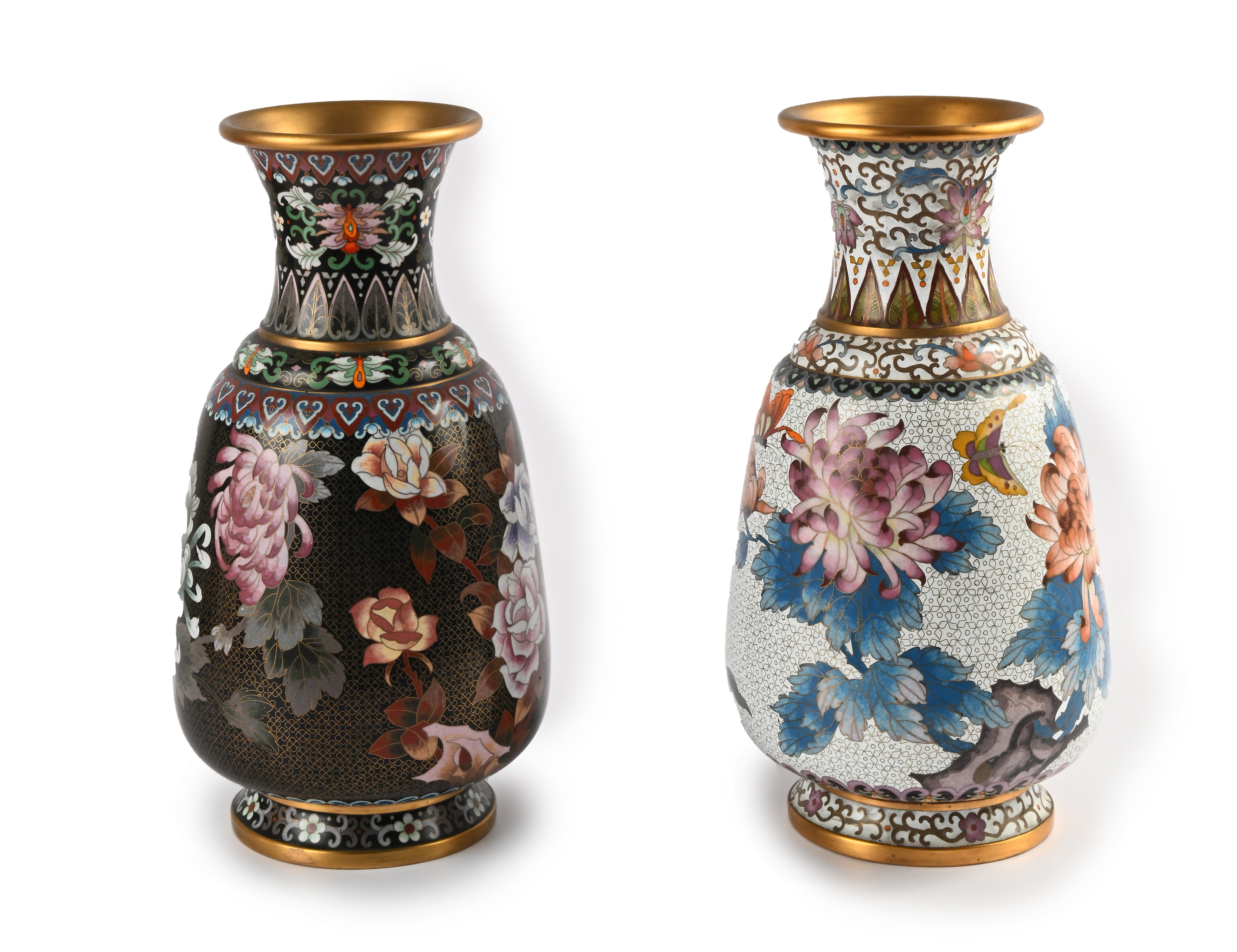 corpi a balaustro decorati da grandi peonie e farfalle sparse rispettivamente su fondo bianco e su fondo nero
