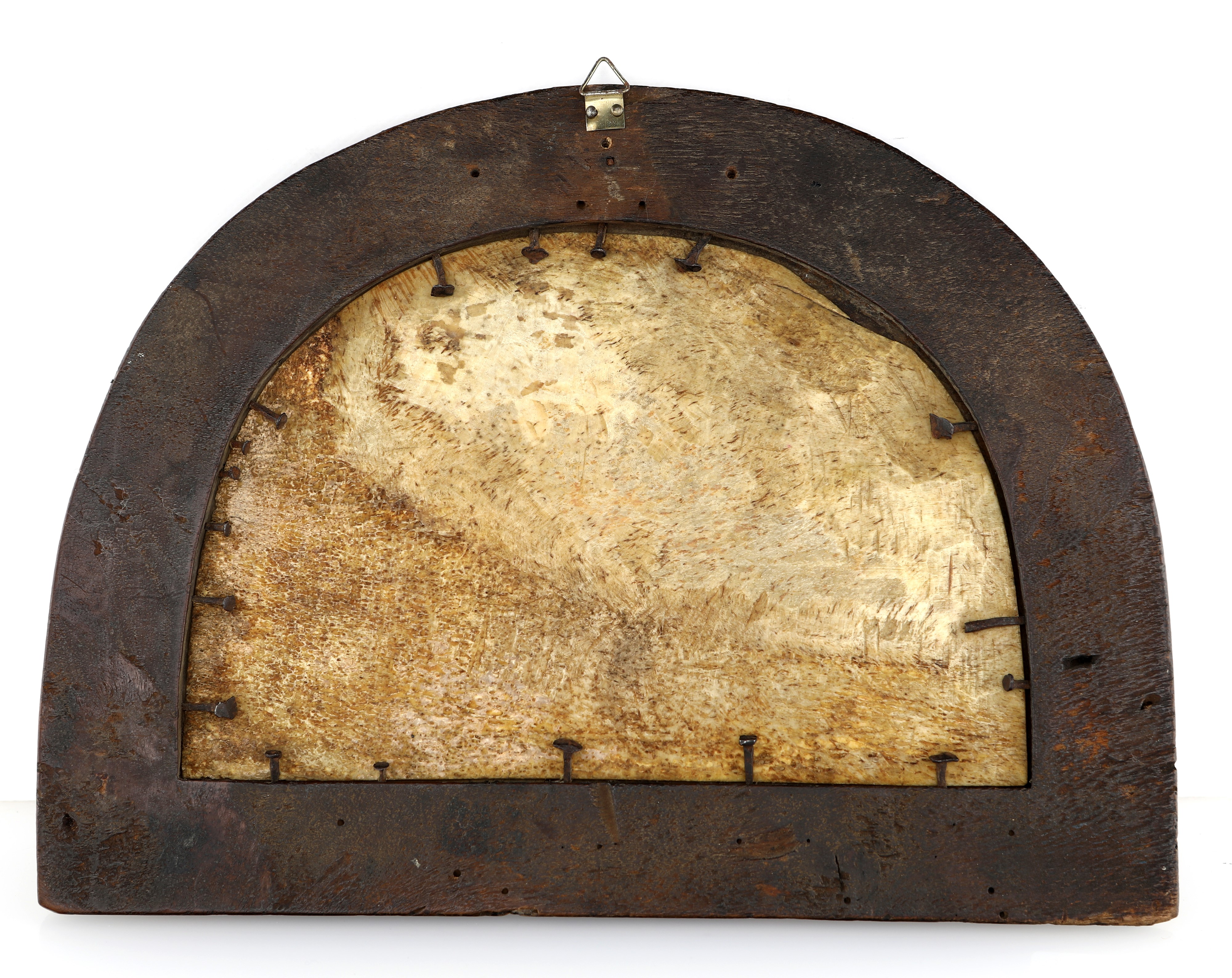 Lunetta devozionale in legno con placca in osso