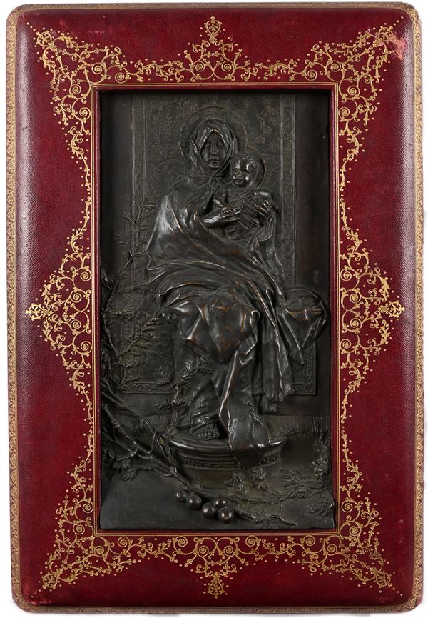 bassorilievo in bronzo Quasi Oliva Speciosa In Campis entro cornice in pelle rossa con decorazione impressa in oro