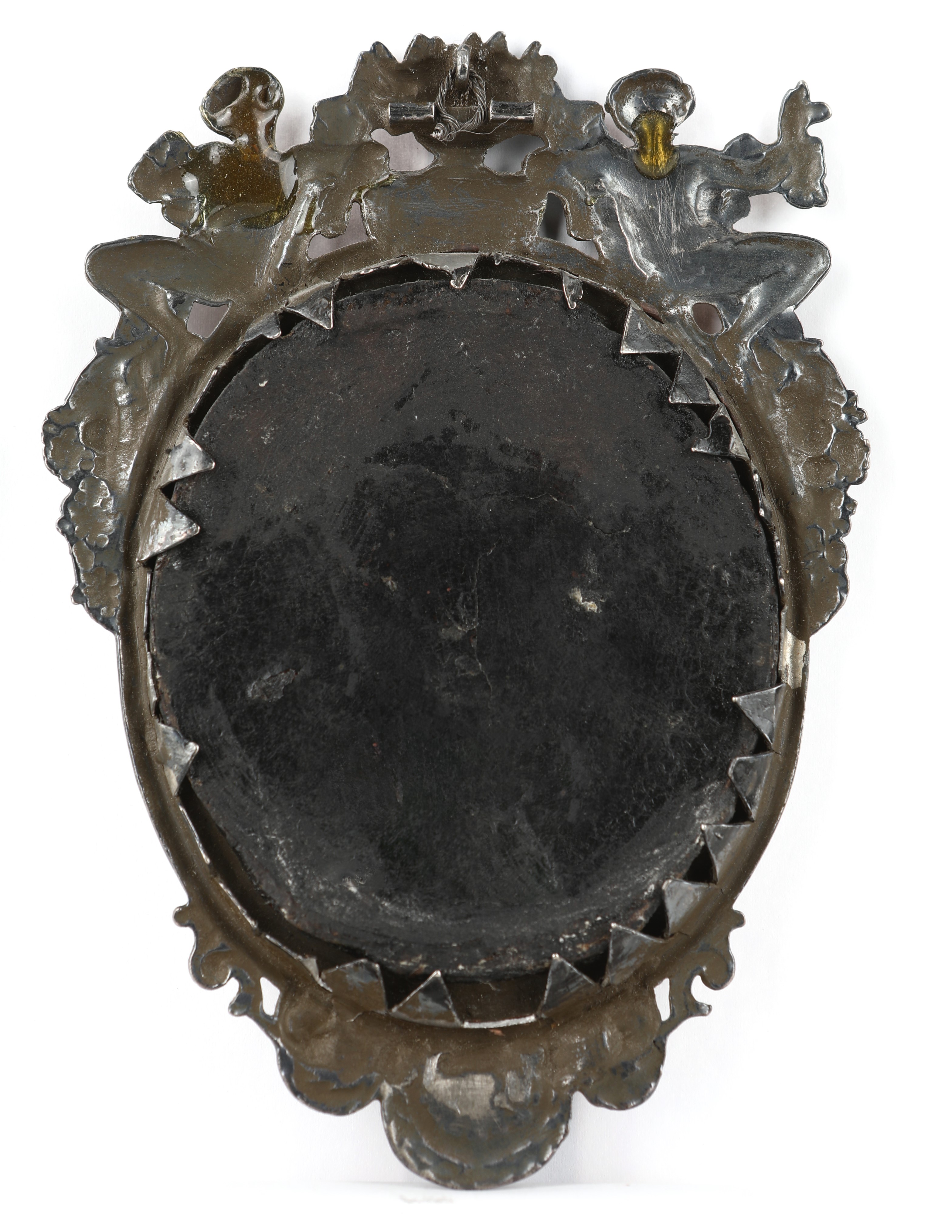 Cornice in peltro sbalzato sormontata da un fastigio con coppa di frutta affiancata da figure allegoriche