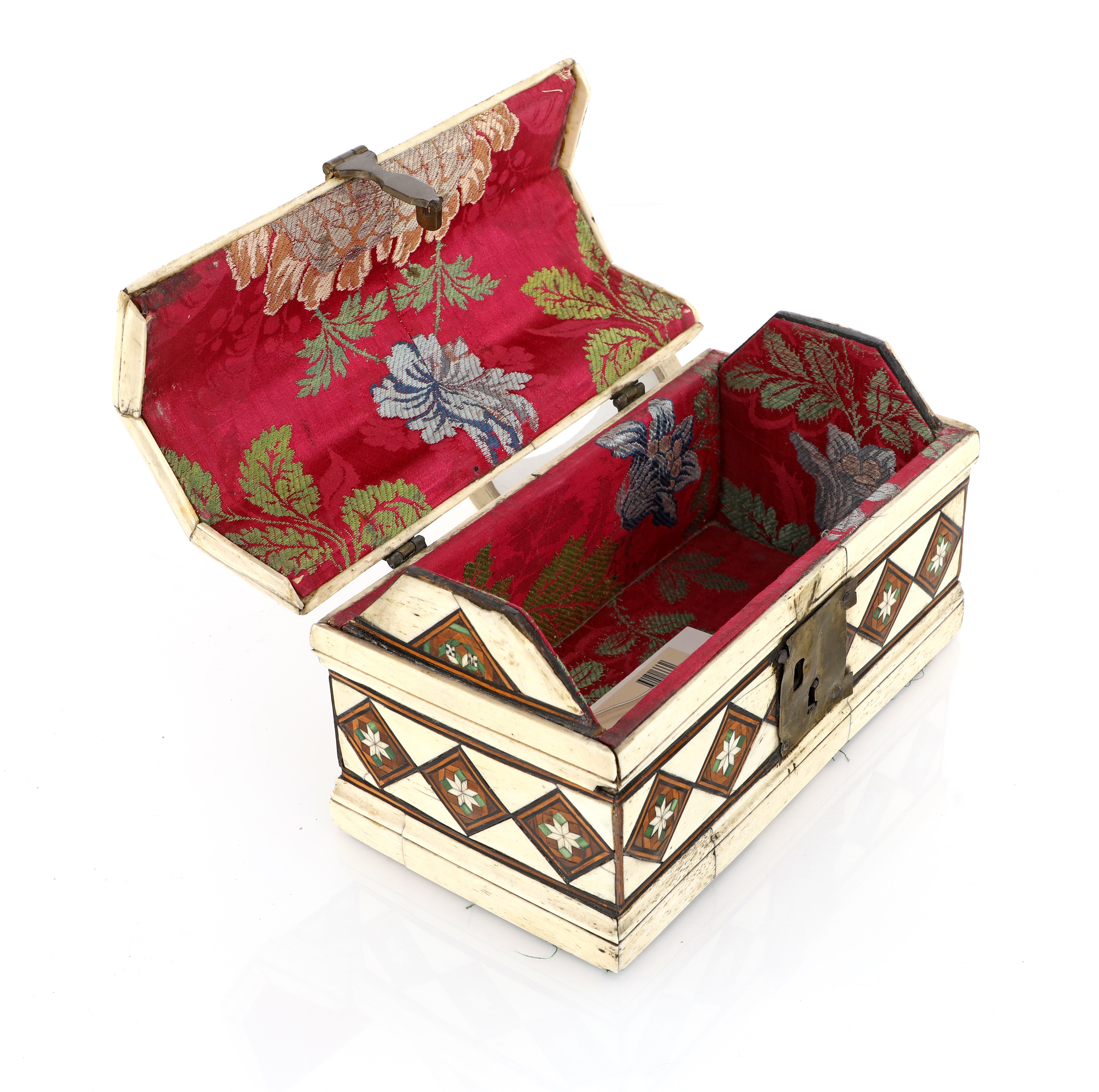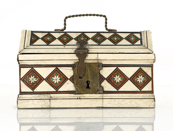 coperchio ad urna incernierato ed interno rivestito in tessuto. Base intarsiata a motivi geometrici. Maniglia e serratura in bronzo